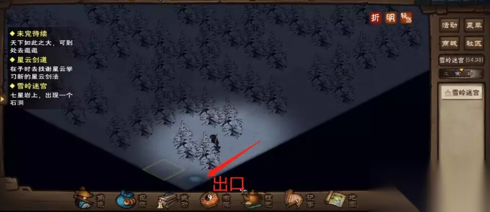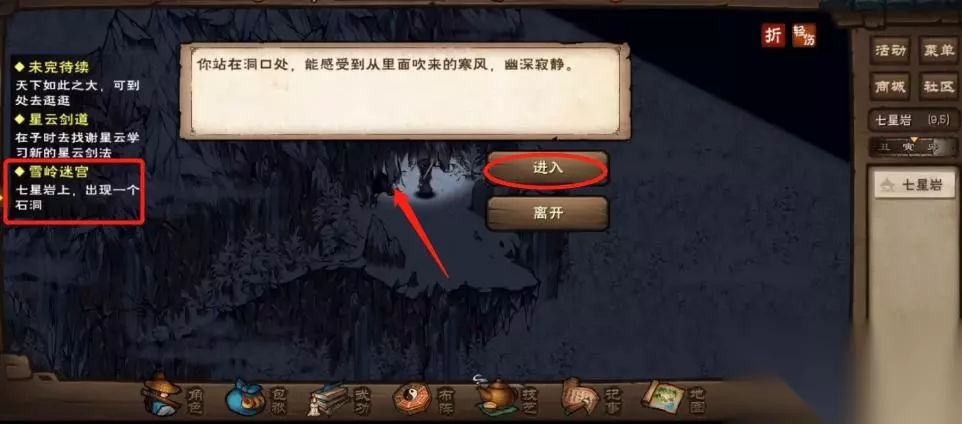 7、七个剑式全部点完后,悬崖壁上就会出现一个洞口(9,5),点击“进入”就会进到雪岭迷宫中。