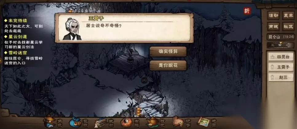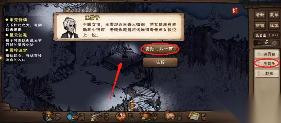 2、然后走到四灵台与玉霄子(19,24)对话选择“寒暄”,然后要给他的玉虚观资助80两,他会告诉玩家他曾看到对面的冰瀑布中有人舞剑。