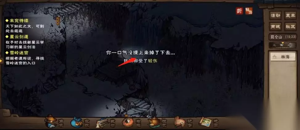 4、接下来就要想办法进入冰瀑布,可以用雁行功九重或者其他可以二段跳的轻功,在(19,24)这里往前跳一格,然后不用动等掉下去就会来到七星岩,这里掉落是会受轻伤的,所以跳下来之前要把随从都下阵。