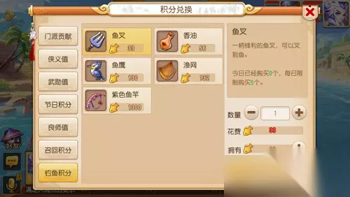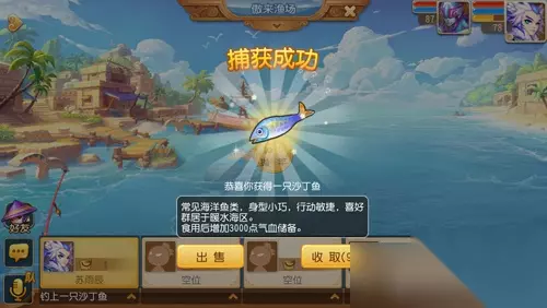 梦幻西游手游宣传图5 PS:钓鱼成功后,会出现上面的界面提示,玩家可以选择收取或者出售,不过不建议出售,价钱太低了。 【垂钓大师,论法宝的重要性】 图5钓鱼法宝 鱼叉:一柄锋利的鱼叉,可以直接插到一条随机种类的鱼。 香油:使用后会能够吸引更多的鱼,提高捕鱼效率,并且增加成功率。 鱼鹰:渔夫的好伙伴,使用后每隔一段时间鱼鹰会帮你捕捉一条鱼。 渔网:使用渔网后直接可以捕捉到若干条鱼。 紫色鱼竿:兑换条件太高,并不知晓他的属性,直接划入神器列表。 大家只要合理利用钓鱼法宝就能够得到最大的钓鱼效率。