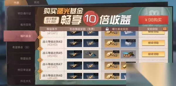 明日之后曙光基金奖励有哪些? 福利基金上新,购买并完成领取全部希望基金奖励的幸存者即可开启曙光基金。曙光基金包含为战斗等级达到31至50的幸存者的全新福利,购买并达到对应等级条件即可领取最多10倍奖励。 曙光基金价格为98元,并且有一个前提条件就是要购买并完成领取全部希望基金奖励的玩家才能够开启。