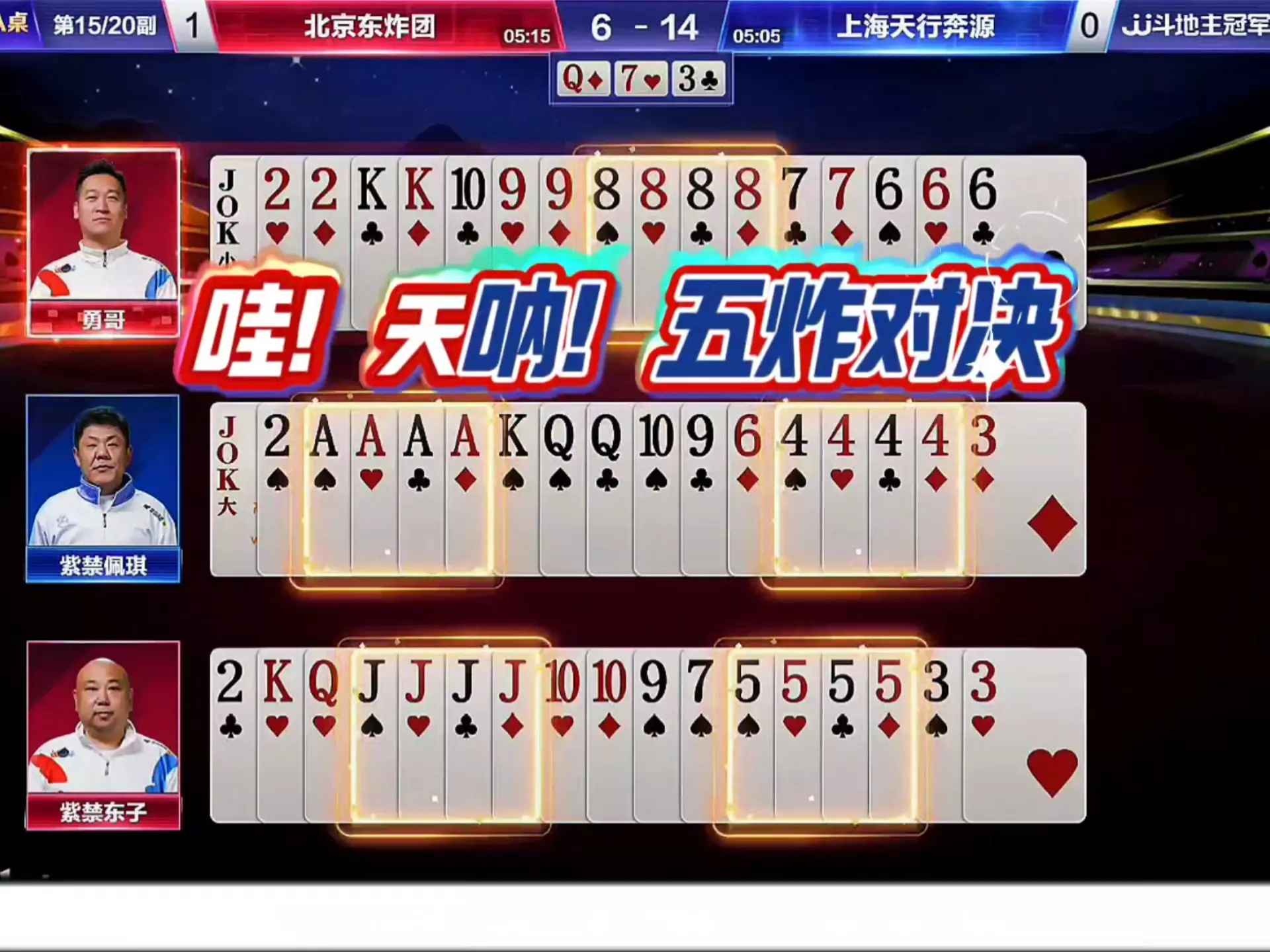这是JJ斗地主冠军杯秋季赛A组的精彩牌局,重庆银河战舰对阵海南四海,地主强行贪炸,选手小狼、马宁、1流在对局中博弈,最终上演了千王之王顶级贪炸翻盘的精彩逆转局。