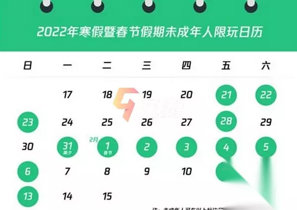 从1月21日到23日9(周五、六、日),1月28日(周五),1月31日~2月6日(春节假期)、2月11日~13日(周五、六、日)的这段时间内每天20点到21点之间可以登陆游戏。而除了上述时间之外,未成年人都无法进入游戏。并且特别提醒,1月29日~30日(周六、日)因为是调休,所以这段时间是禁玩日期。