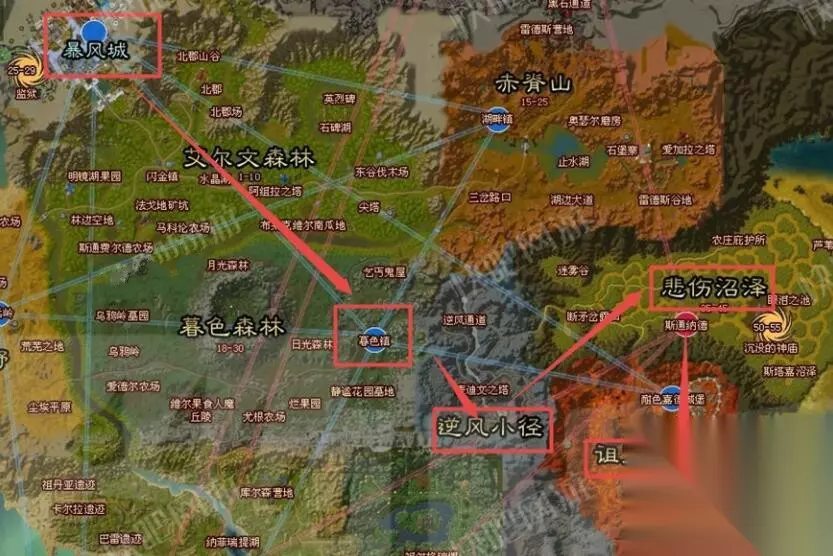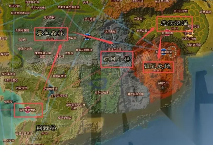 联盟玩家: 从暴风城出发,来到暮色森林【暮色镇】,从右侧出暮色森林,进入逆风小径。沿大路一直往右走到达悲伤沼泽,然后沿着南面的路往下走可以一直走到诅咒之地 。
