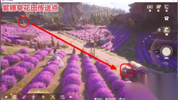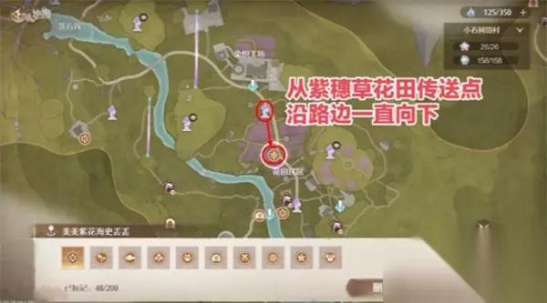 2、【美美紫花海】 传送点指引:小石树田村【紫穗草花田传送点】 任务点位:顺着花田小路向下走,抵达道路尽头箱子旁 路径说明:沿主路走至尽头即可发现贴纸,贴纸位于道路边缘靠近箱子位置