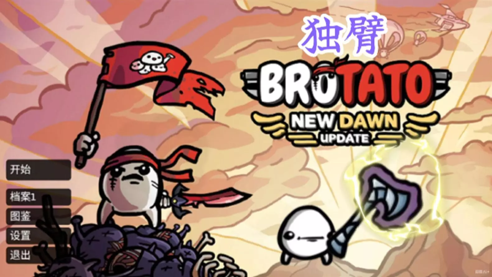 这是单机游戏《土豆兄弟》的玩法分享,展示了独臂角色搭配单武器的爆炸流玩法,该角色有攻击速度、伤害加成但仅能装备1种武器,搭配幽魂斧、粉碎者等武器,可在危险5难度下应对怪物潮。