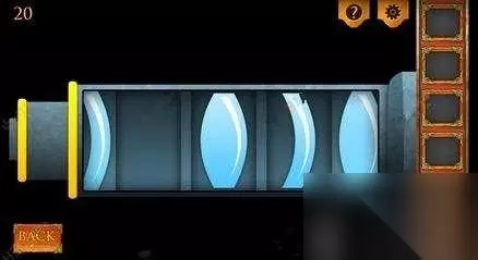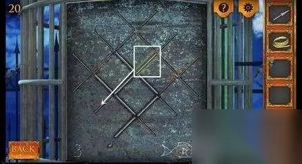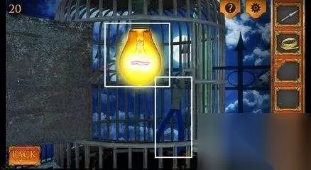 四、点击画面左边鸟笼,点击一根铁棍会传出淡黄色的光,再点击空的凹槽会放入相应的位置,随后如图所示最后一根放到相应位置即可打开门,获得灯泡和钳子。