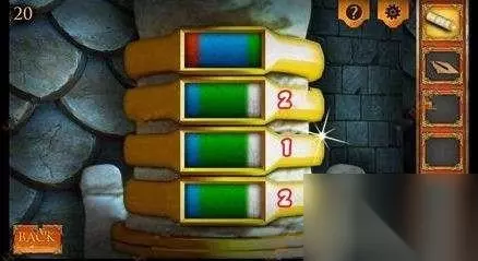 十四、随后点击门左侧的雕像,将脖子上的圆环全部调节成蓝、绿、白色,下面三个均会互相影响,第二个点2下,第三个点1下,第四个点2下即可调整成下图中的模样,最终多点两下第一个即可解开,即可获得雕像中的玻璃镜片。
