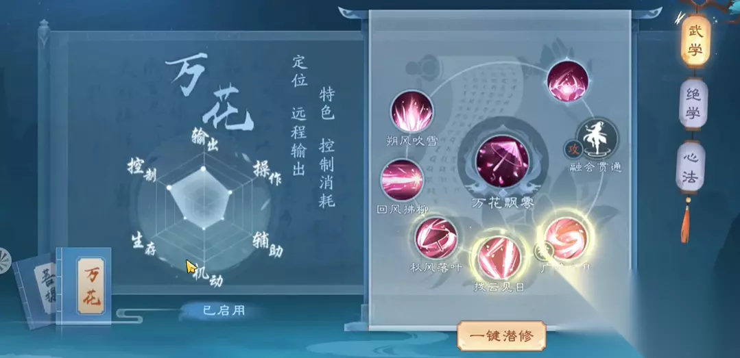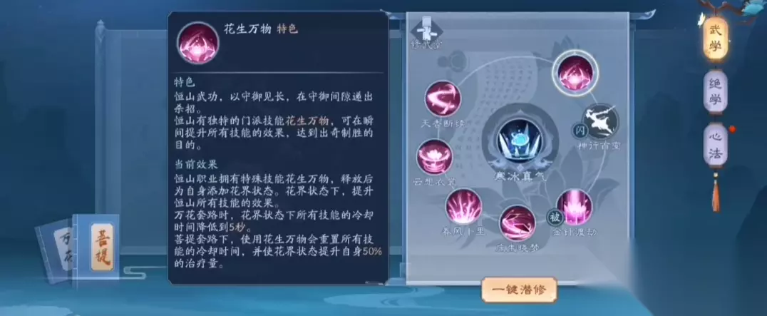 恒山派作为治疗与防御兼备的职业,心法设计围绕增益效果与生存能力展开。花生万物是核心被动技能,提供持续10秒的伤害增益;万花飘零兼具治疗与范围伤害;朔风吹雪通过叠加减速和减防效果削弱敌方战力;回风拂柳的穿透伤害和拨云见日的广域攻击进一步强化输出能力。护体真气和神行百变是防御型加点的关键,前者提升抗伤能力,后者增强机动性。