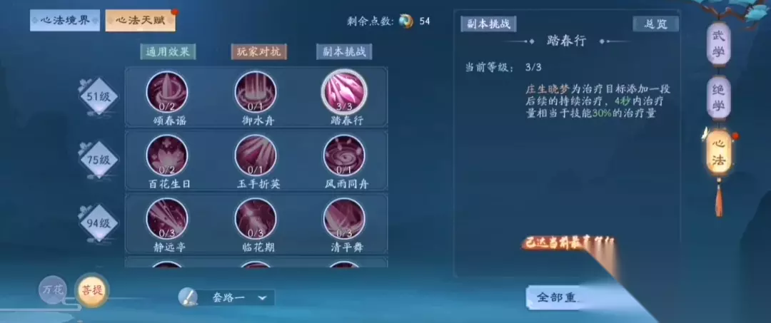 在团队副本中,恒山需优先强化治疗技能,如颂春谣、踏春行、百花生日等,配合静远亭的残血治疗增益和临花期的持续恢复效果。竞技场景则需侧重控制与反制,暗香疏影和青丝戏鸾可干扰敌方行动,云流秋月与芳菲未尽提供爆发伤害,弱水三千和雪履三秋则用于应对高压力局面。天赋重置功能允许玩家根据需求调整配置,但需注意资源消耗。
