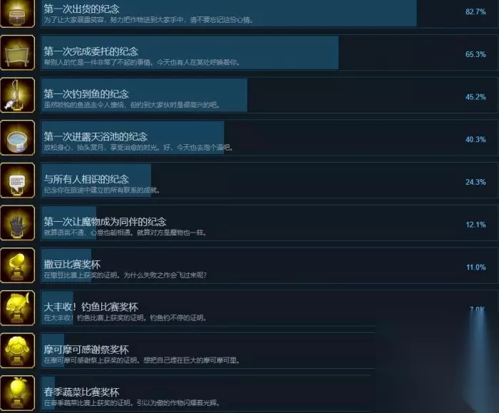 第一次出货的纪念 解锁条件:为了让大家展露笑容,努力把作物送到大家手中,请不要忘记这份心情。 第一次完成委托的纪念 解锁条件:帮别人的忙是一件非常了不起的事情。今天也有人在某处呼唤着你。 第一次钓到鱼的纪念 解锁条件:虽然咬钩的鱼逃走令人懊恼,但钓到大家伙时是很高兴的吧。 第一次进露天浴池的纪念 解锁条件:放松身心,抬头赏月,享受治愈的时光。好,今天也去泡个澡吧。 与所有人相识的纪念 解锁条件:纪念你在旅途中建立的所有联系的成就。 第一次让魔物成为同伴的纪念 解锁条件:就算语言不通,心意也能相通。就算对方是魔物也一样。