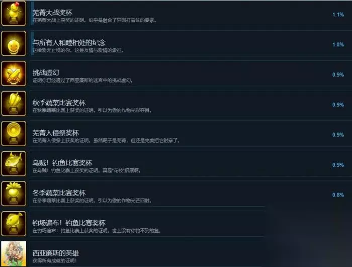 所有物品全部出货的纪念 解锁条件:你已经精通了《符文工厂3豪华版》。这一成就是为了纪念你的努力。 龙之遗迹 解锁条件:证明你已经通过了西亚廉斯的迷宫中的龙之遗迹。 芜菁大战奖杯 解锁条件:在芜菁大战上获奖的证明。似乎是融合了异国打雪仗的要素。 与所有人和睦相处的纪念 解锁条件:送给爱无止境的你。这是友情与爱情的象征。 挑战虚幻 解锁条件:证明你已经通过了西亚廉斯的迷宫中的挑战虚幻。 秋季蔬菜比赛奖杯 解锁条件:在秋季蔬菜比赛上获奖的证明。引以为傲的作物光彩夺目。 芜菁入侵祭奖杯 解锁条件:在芜菁入侵祭上获奖的证明。虽然靶子是芜菁,但还是完美把它射穿了。 乌贼!钓鱼比赛奖杯 解锁条件:在乌贼!钓鱼比赛上获奖的证明。真是“花枝”招展啊。 冬季蔬菜比赛奖杯 解锁条件:在冬季蔬菜比赛上获奖的证明。引以为傲的作物光芒四射。 钓场遍布!钓鱼比赛奖杯 解锁条件:在钓场遍布!钓鱼比赛上获奖的证明。世上没有你钓不到的鱼。 西亚廉斯的英雄 解锁条件:获得所有成就的证明!
