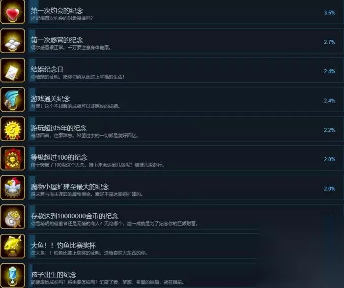 游戏通关纪念 解锁条件:恭喜!这个不起眼的成就可以证明你的成绩。 游玩超过5年的纪念 解锁条件:蓦然回首,往事难忘。希望过去的一切都是美好回忆。 等级超过100的纪念 解锁条件:终于突破了100级这个大关。接下来会达到几级呢?随便几级都行。 魔物小屋扩建至最大的纪念 解锁条件:渴求着与尚未谋面的魔物相会。幸好不是达丽娅扩建的。 存款达到10000000金币的纪念 解锁条件:你是精明的储蓄者还是无情的商人?无论哪个,这一成就是为了纪念你的巨额财富。 大鱼!!钓鱼比赛奖杯 解锁条件:在大鱼!!钓鱼比赛上获奖的证明。送给喜欢大东西的你。 孩子出生的纪念 解锁条件:能健康地成长吗?将来要怎样呢?汇聚了爱、梦想、希望的结晶,就在眼前。 森林讨伐队 解锁条件:证明你已经通过了西亚廉斯的迷宫中的森林讨伐队。