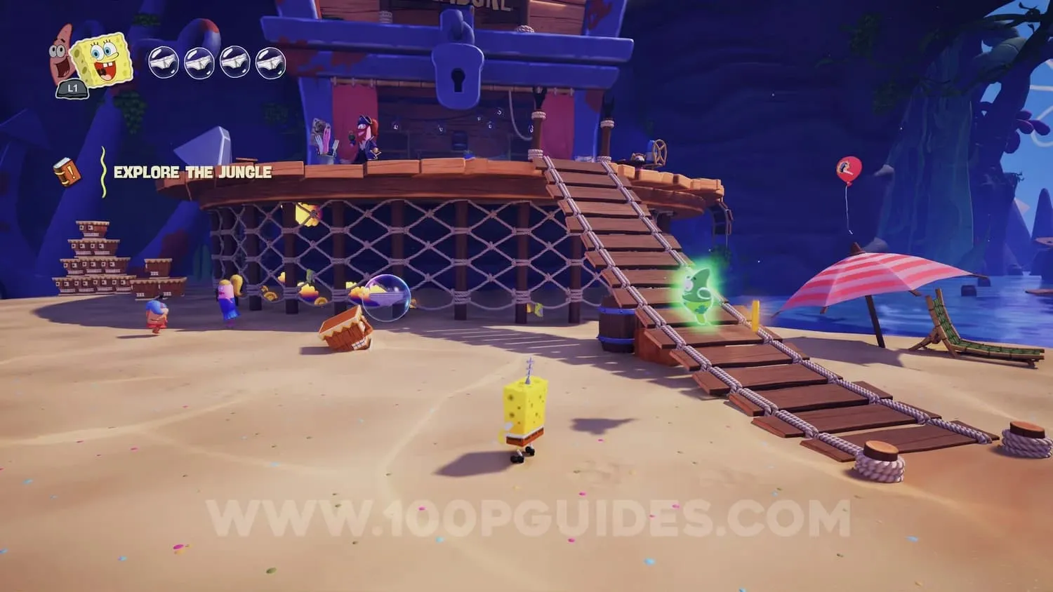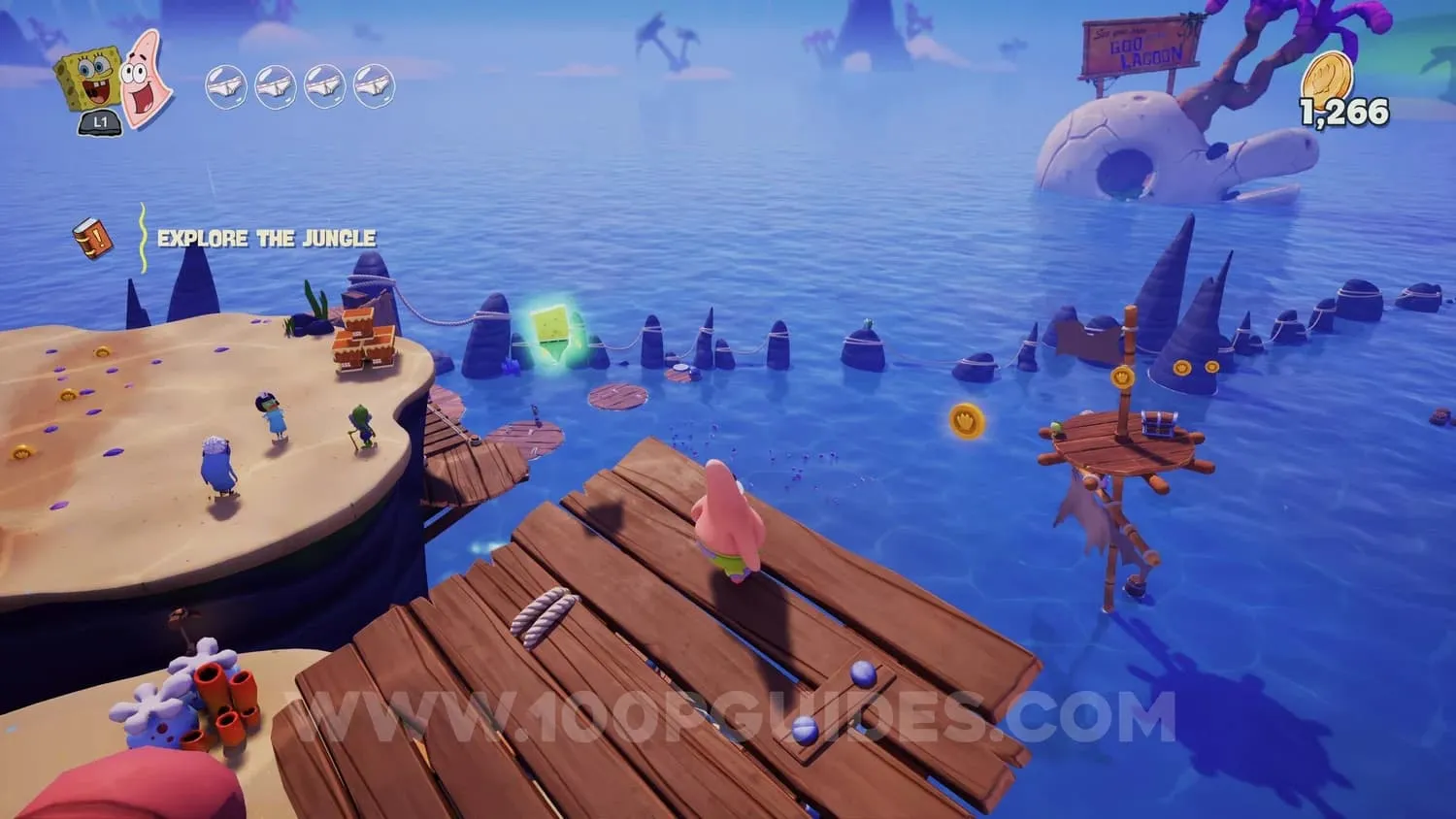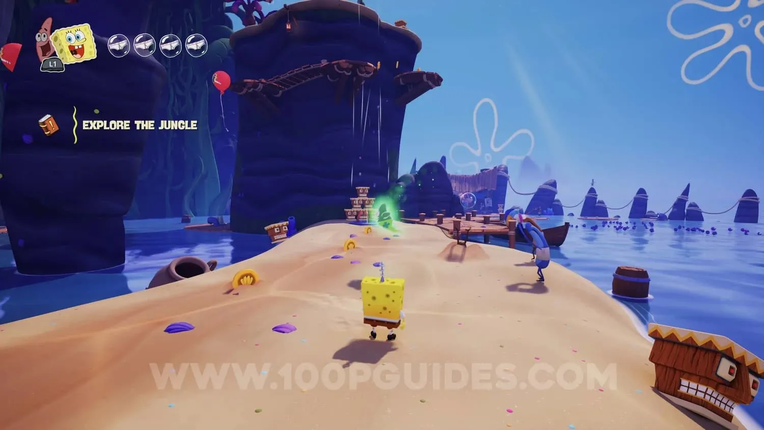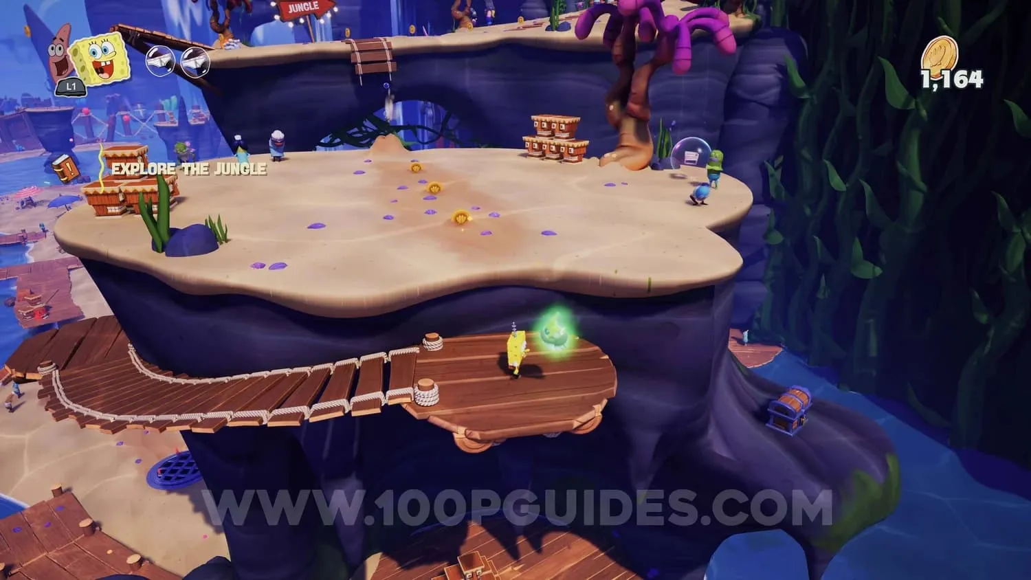 进入丛林区域后,使用帕特里克的抓钩延伸平台,到达一个圆形区域,那里有一些金币和两个NPC。进入地下,收集一圈金币,宝箱就会出现。