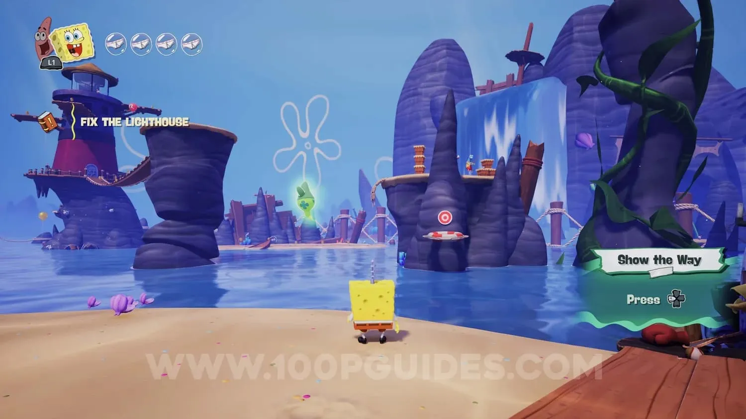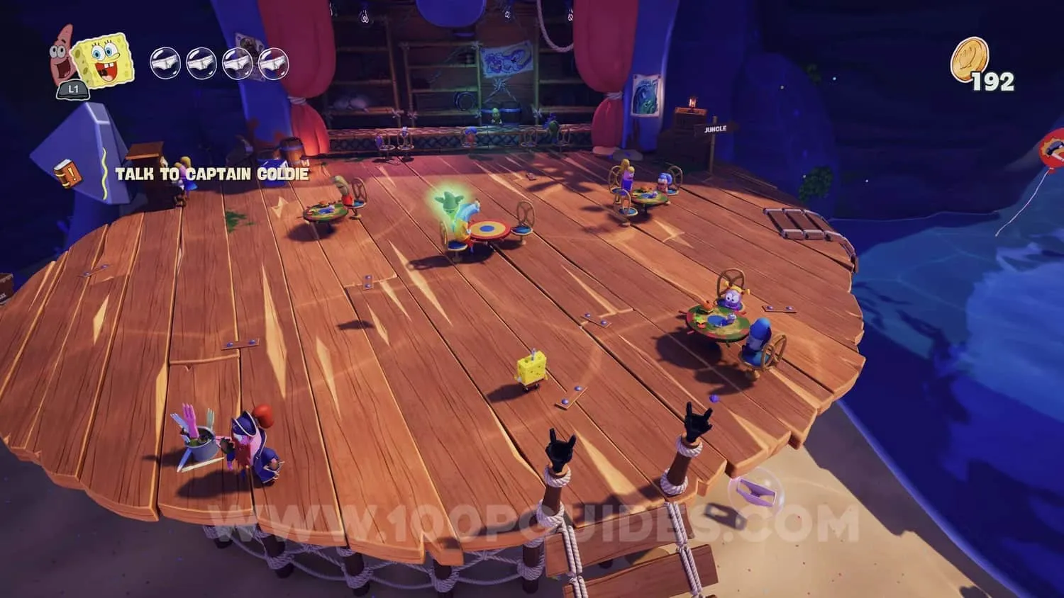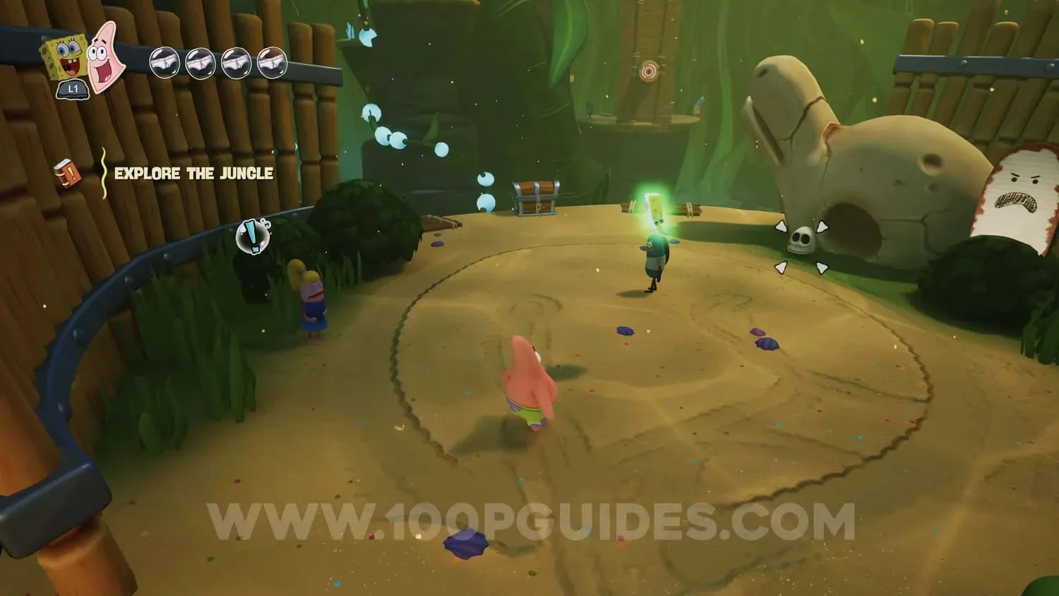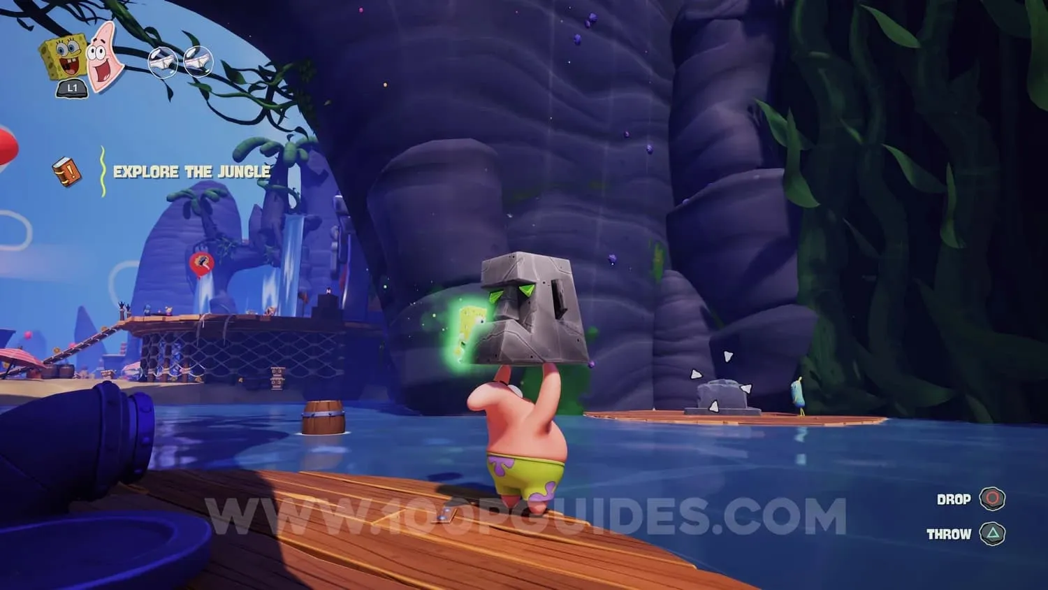 使用帕特里克将石头脸扔到戈尔迪宝藏餐厅右侧岩石下方的石头身上。