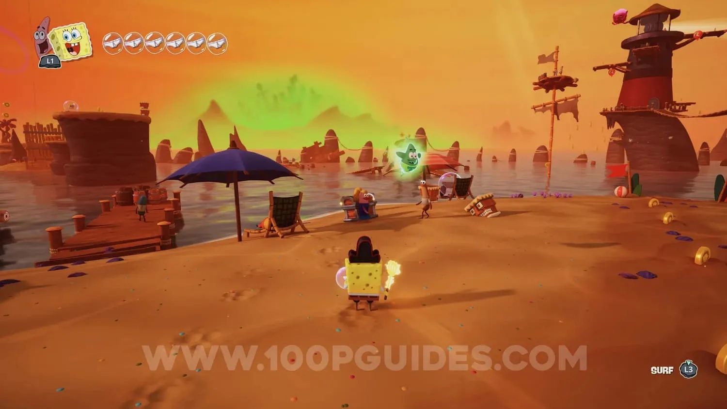 跳到 Goldie's Treasure 餐厅左侧沙滩上的所有 5 把沙滩伞上。