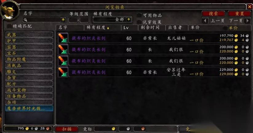 三,提布的炽热长剑。巫术之刃,提布的炽热长剑跟巫术之刃作为模型差不多的武器,跟《星球大战》中的激光剑一般的造型是众多星战粉的追求。安苏服务器AH给出的价格在20万左右金币的价格。提布的炽热长剑是60级左右的小怪都有几率掉落,精英怪的掉落几率更大。巫术之刃是70级左右的精英怪掉落。但是面对如此高的价格,我给大家的意见是退而求其次,可以尝试考虑一下奴隶围栏副本中掉落的魔焰长剑。