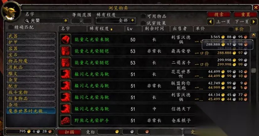 五,光荣腿铠。作为板甲为数不多的好看的还可以装绑的绿装幻化一直是很多女人类跟女血精灵的菜。这两个种族有着相同的特点——姣好的身材跟面孔。由于板甲的幻化缺少比较暴露的套装,使的这些玩人类跟血精灵板甲职业的老爷们心花怒放,终于有地方可以释放一下自己的暴露癖。再加上光荣套一身黄金色,更使得这个两个种族穿上魅力大增,才使得光荣套供不应求,价格一涨再涨。再加上套装中腿部的掉落更为困难,才使得光荣腿铠的价格一路勐涨。安苏服务器给出的价格是28万。 在游戏过程中大家拾取的装绑装备先不要急于卖给商人,有条件的话可以去拍卖行查看一下装备实际的价格,以避免损失。还要注意的一点是,在排低等级副本的时候就算是装绑的装备如果选择需求是不能够交易的,你需要选择贪婪。你们说还有那些价值比较高的装备呢?