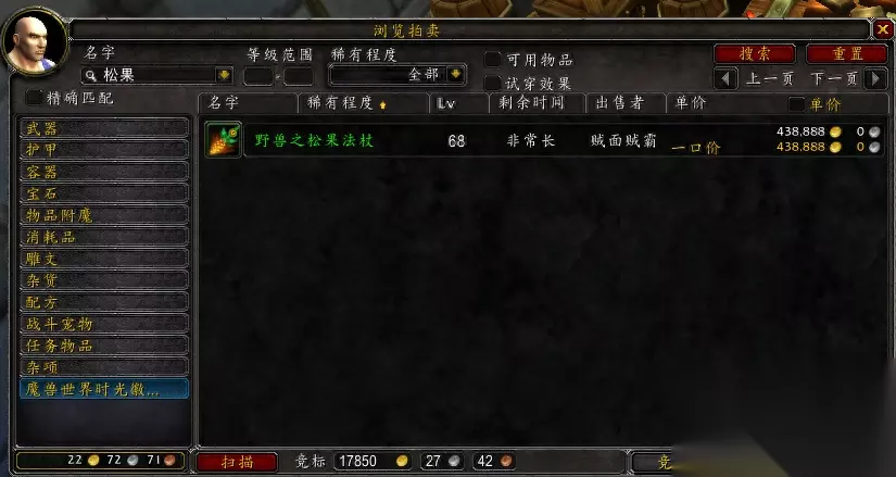 四,松果法杖。玉米杖好多新手玩家乍一听这个名字实在是不熟悉,但是作为60年代的老玩家,对着玉米杖可是印象深刻,也是一代人对魔兽世界情怀的寄托。在60年代这个可是毕业的武器。而绝版之后,终于有了现在的松果法杖,让60年代的老玩家有了收集这款法杖的冲动。安苏服务器由于今天没有这个武器的出馊,一区白银之手AH 给的价格是43万。
