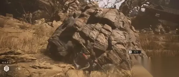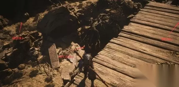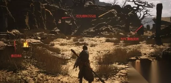 NPC黄袍员外:参考上图。左前为佛目珠6。右侧小怪身后的隘口后有一大片平原,有一个可对话的猪妖NPC就是黄袍员外。其处于醉酒状态,要帮他找醒酒石。醒酒石可在石中人处购买,或在卧虎寺路线后期捡到。 打坐蒲团2:黄袍员外所在平原末端的歪脖子树下。 妖王石先锋,妖王石敢当(隐藏BOSS):上图中间,过石头牌坊后直接向前会触发石先锋BOSS战。集齐6颗佛目珠后可与牌坊左侧巨石互动,召唤BOSS石敢当。石敢当和石先锋之间会互相战斗。石先锋掉落石之厉,用于开启关键大门。石敢当掉落受蕴和出云棍铸造材料等。