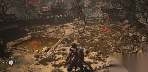 我们还是按照每两个土地庙之间的路程分段,方便查漏补缺。按照获得的先后顺序来排收集要素。 出生点-沙门村(村口) 相信大家刚出门走两步就明白为啥天命人是万箭穿心状态登场的了吧…… 羔儿酿:酒水,和初始的椰子酒拥有不同的回血效果。从出生点出发右侧有弓箭手的高地上,左手边牌坊内。 拿完后回到原来出生面朝的方向,沿着地图左侧走可以看到金色引导,来到沙门村(村口)。 沙门村(村口)-沙门村(不济谷) NPC戌狗:点亮土地庙后先别顺着小木桥往村里走,跳下小木桥,沿着沟往右侧走。进入山洞可以看到NPC戌狗。交谈获得任务。 头目浪里个波:戌狗面朝方向的水坑里。击败后返回与戌狗交谈。 打坐蒲团1:戌狗面朝方向左侧的凉亭里。
