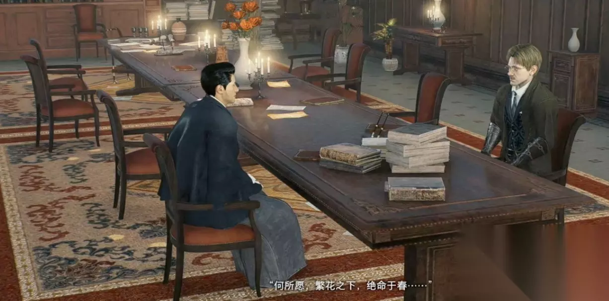 进入贵宾馆即可触发任务剧情,NPC(鼓吹主张侵略的军国主义)跟英国口译人员NPC在进行交流讨论。 我们将先要与哈里斯见面的想法告知俩人后,NPC将哈里斯的位置告诉了我们。