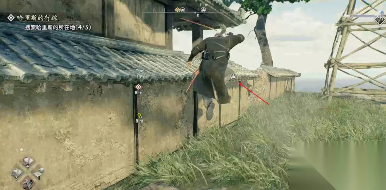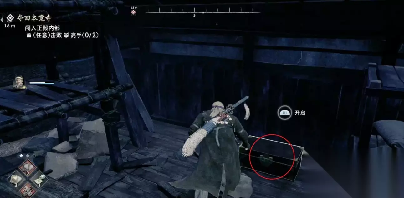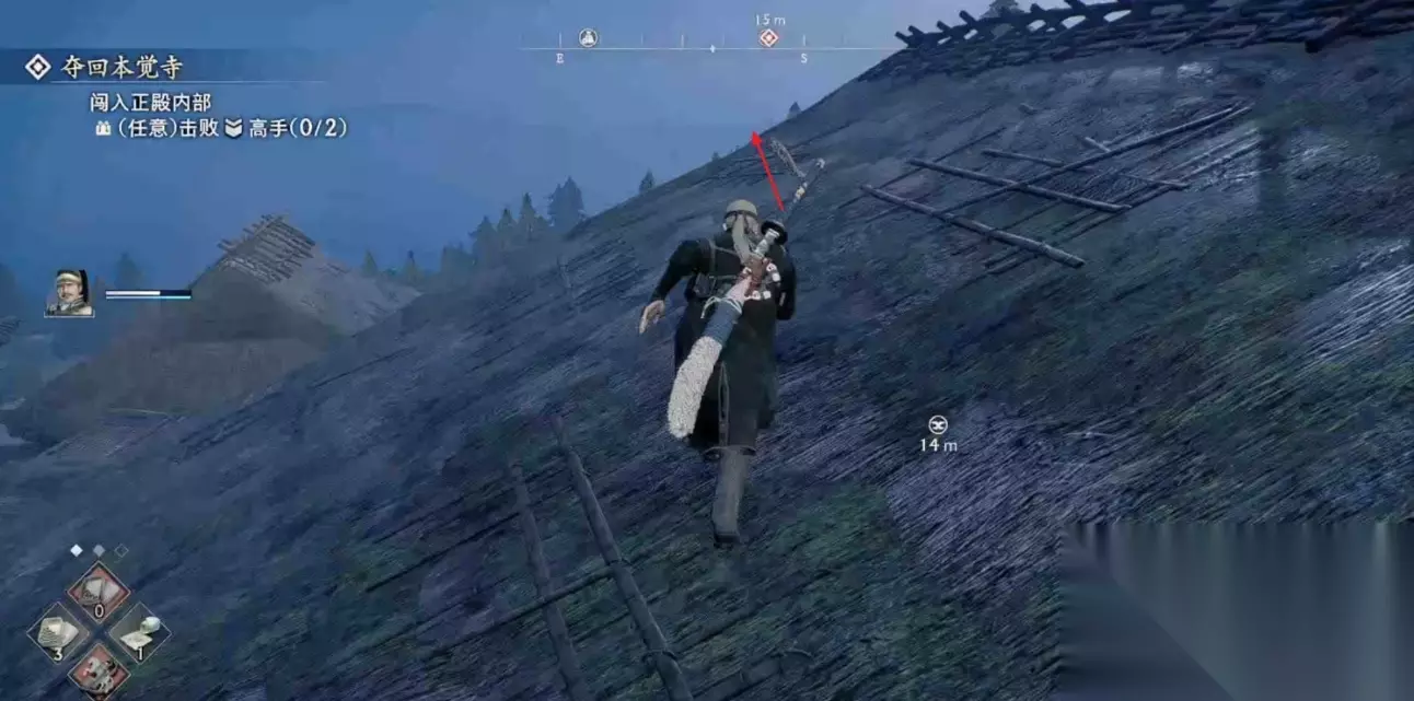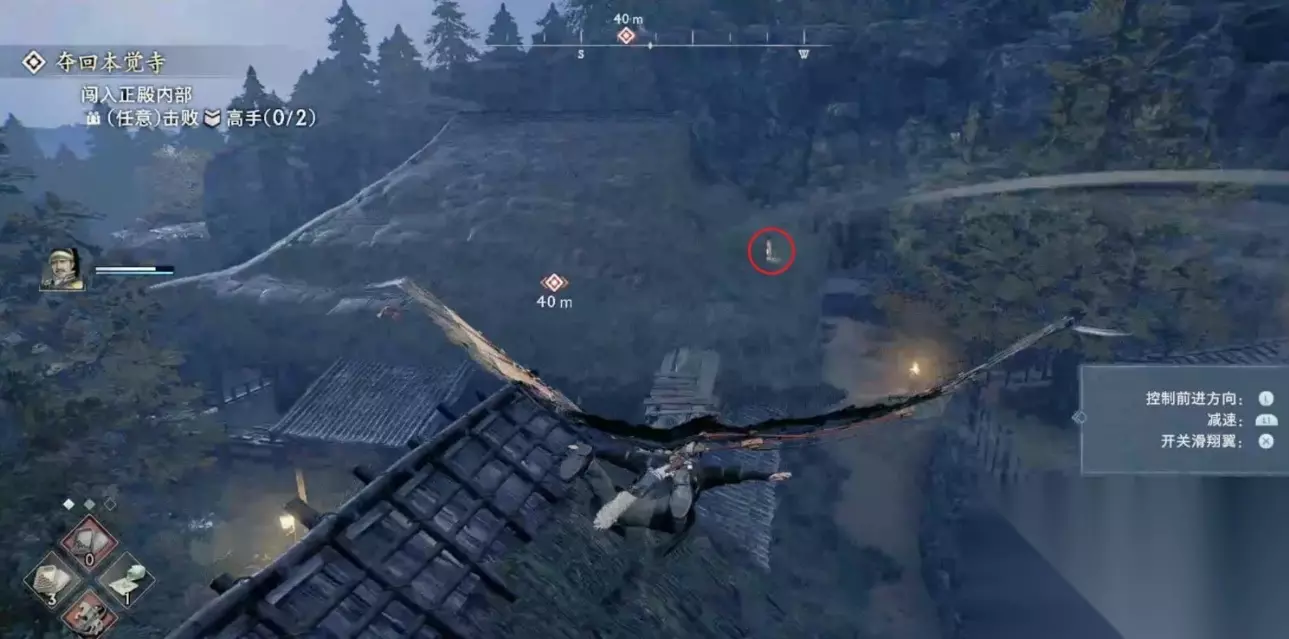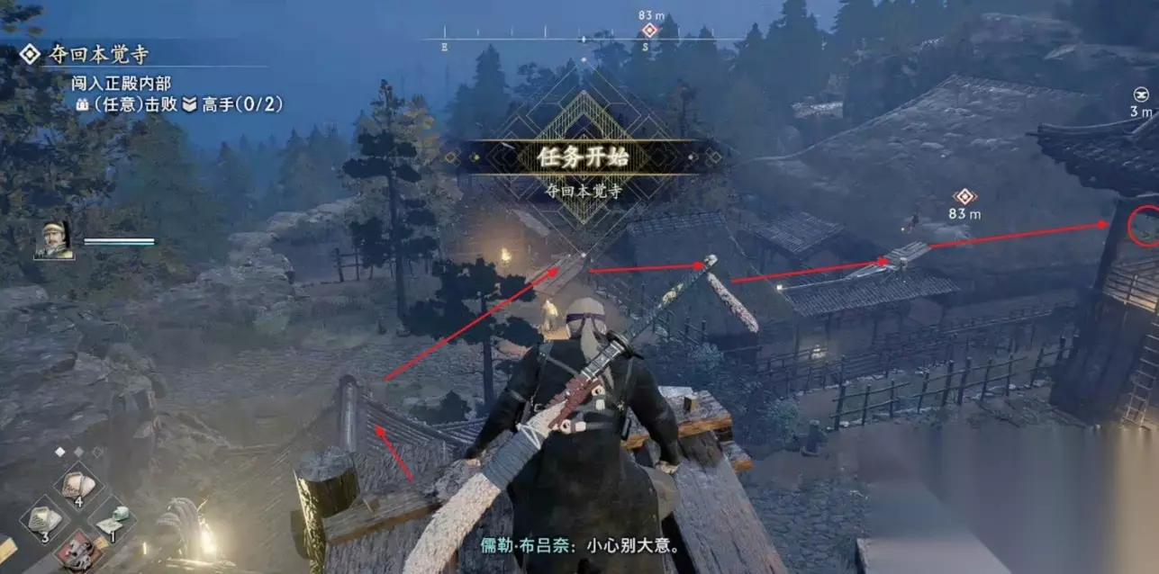 来到本觉寺与NPC对话开启夺回本觉寺任务,先从高台跳到离我们最近的房顶。 跟着下图路线走,在寺庙大殿的右侧屋顶可以看到一个可以潜入的通道,大殿的正门的无法打开的。