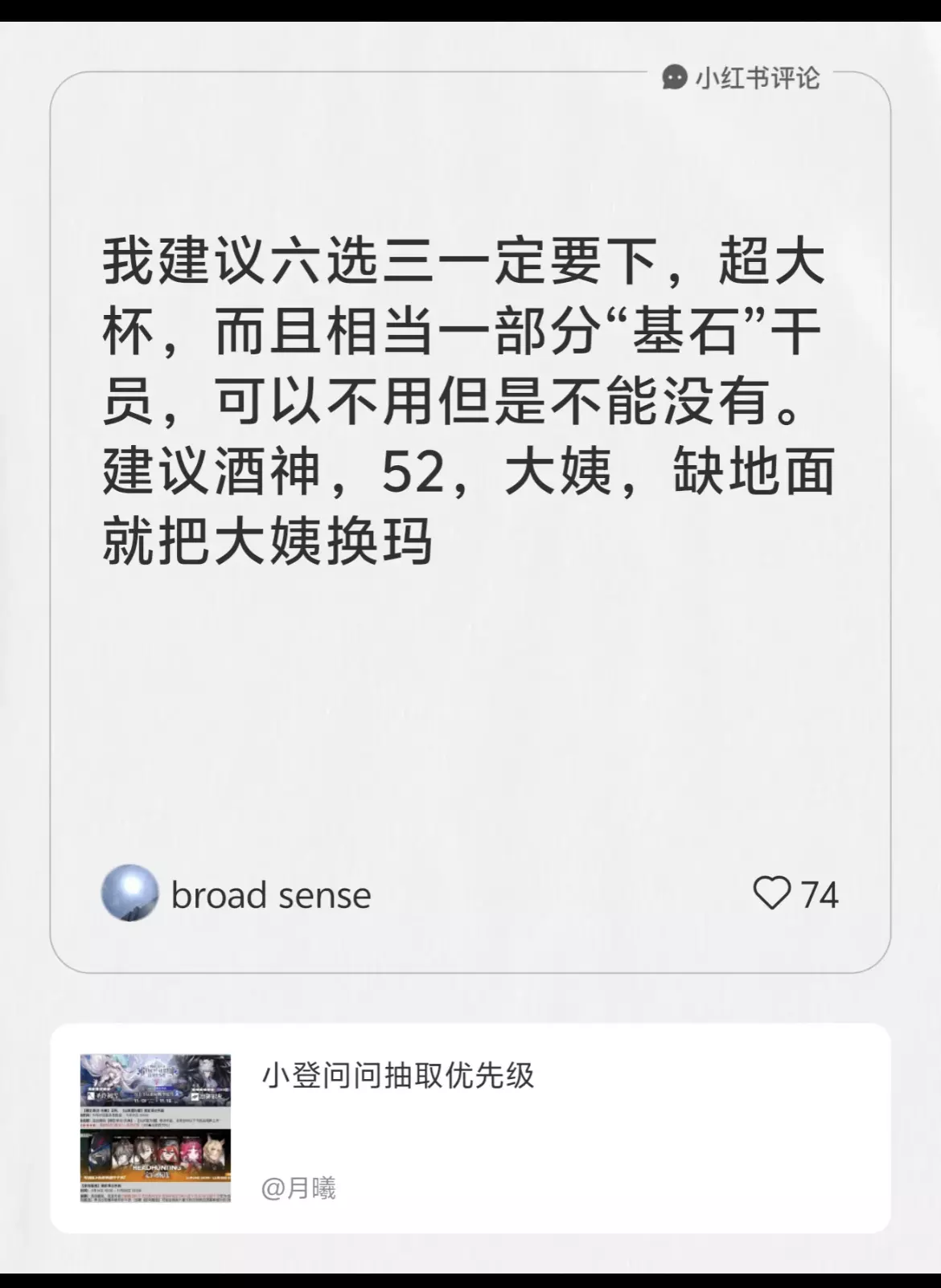 建议六选三一定要下,有相当一部分“基石”干员,可以不用但是不能没有。建议酒神,52,大姨,缺地面就把大姨换玛。 ⅰ 乌尔比安,52,饼干,左一,深海队大鲸鱼,二技能暖机好了就基本无敌了,需要配一个歌蕾蒂娅。 ⅱ 酒神,左二,无敌的猫神,控制第一档,诱导第一人,合约已经见证了辉煌,没有理由错过。 ⅲ 白铁,左三,偏杂技,主要用途是给情报官一技能稳定回技力,不建议选(主要是谜图)。 ⅳ 右三,大姨,娜仁图雅,回环射手,挂机和手动输出都能行,作为高台也有不俗的防御,不至于脆皮一击倒。不强制拥有但是部分图不可替,功能上独一档。 ⅴ 右二,妮芙偏杂技/合约,走永控。有点输出但是不值得为输出抽,有图图(2226,阿尔图罗)也不值得,不如罗。想玩永控的可以抽,很有意思,合约有用。 ⅵ 右一,叔叔,玛恩纳,黄色幻神之一,大范围真金斩,增加模组后偏向拔插。低费大范围解放者,缺地面的可以拿,有惊蛰的不必拿。作为一个解手流废物我觉得作业里用的蛮多的,真银斩真金斩惊蛰斩一起上不嫌多。 总上,建议各位萌新抽完规划内6.5周年后不要跳过本池,优先左一(52),左二(酒神),右一(叔叔),右三(红色的大姨)。 后续还有年限池(望/易/绩)和明年二三月怪猎二联(包括复刻夜刀),博士们量力而行。 二编补充: 萌新前期可以提高玛恩纳优先级,是输出决战技,打多且对空。52更偏向站场,二技能类似煌挂机,三技能飞肘伤害很够但是只是打单。感谢评论指正。 #明日方舟 #游戏攻略 #明日方舟反常光谱 #明日方舟半周年 #明日方舟半周年庆 #定向甄选 #明日方舟攻略 #明日方舟定向甄选 #明日方舟六周年 #明日方舟雪山降临1101