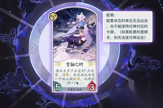 雪童子:是一位控制与输出兼备的式神,配合雪女能够施展出强大的压制力,另外值得注意的是雪童子在三级“雪融之时”形态下每次至多只会受一点伤害,将是一个非常难缠的敌人。