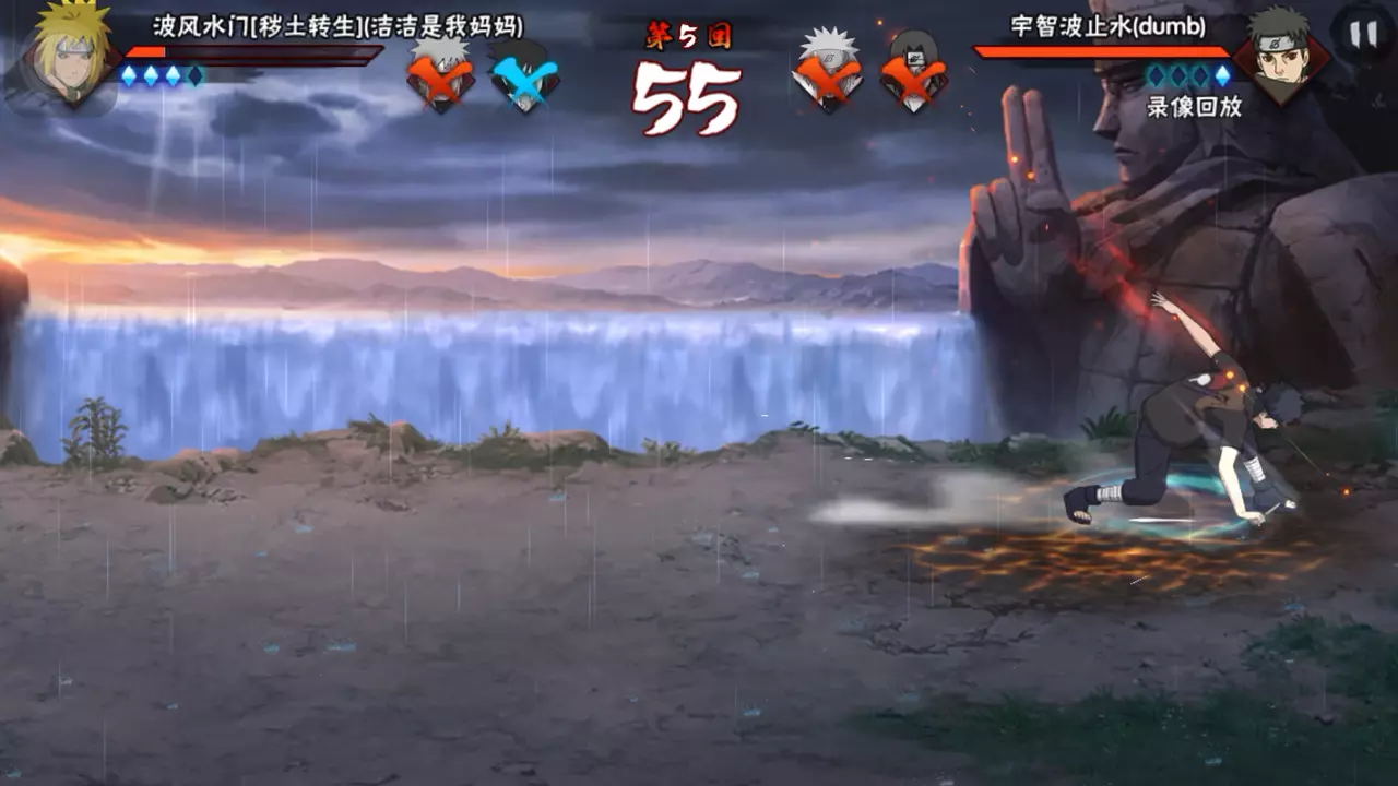 这是火影忍者手游的对战录像回放,展示了鬼灯满月[忍刀七人众]分别对阵宇智波鼬[新春限定]、小南[神驹佑将]的精彩对战画面,呈现了忍者技能释放的战斗场景。