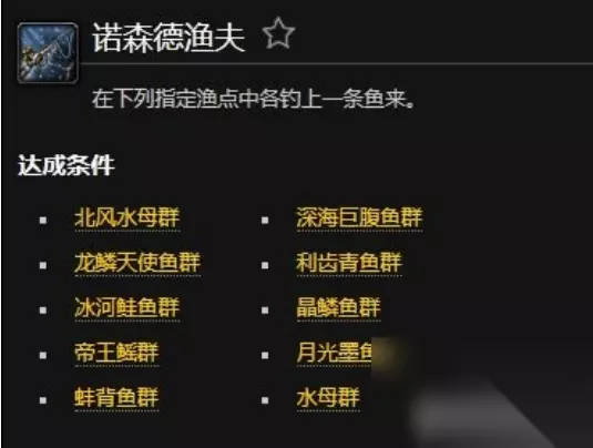 需要完成钓到以下鱼类才能完成任务: 1、北风水母群:在诺森德大多数的近水流域找到。最容易的地方在北风苔原。 2、龙鳞天使鱼群:龙骨荒野的内陆湖。 3、冰河鲜鱼群:灰熊丘陵的内陆湖。 4、帝王解群:与北风水母群靠的非常近。 5、蚌背鱼群:北风苔原的内陆湖。 6、深海巨腹鱼群:位于北风苔原和尖啸海湾的南岸。 7、利齿青鱼群:尖啸海湾的内陆湖。 8、晶鳞鱼群:水晶之歌森林过后的小河。 9、月光墨鱼群:沿着诺森德的南海岸寻找。 10、水母群:搜拉查盆地的内陆湖。 PS:这个成就难度不低,需要在每个钓鱼点都钓鱼才能完成。 钓鱼技巧攻略: 答:找到钓鱼训练师学习钓鱼技能,在商人处购买鱼竿装备上,前往湖边钓鱼,在鱼漂下沉的时候拉起鱼竿。