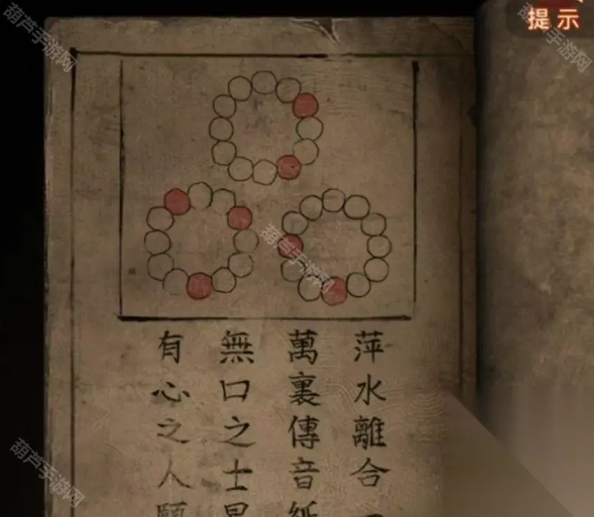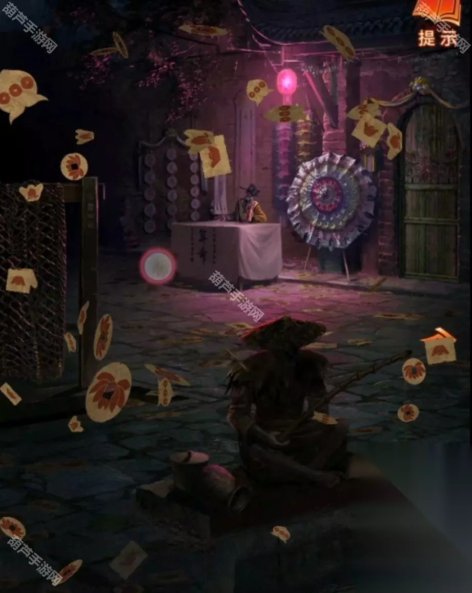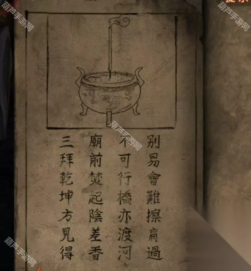 此时翻看一下无字书又更新了,提示是要烧香了,先查看算命右边的门,将龟壳给装上去后调掉出三根香和一张纸条,纸条上是奇怪的图案,看起来是需要对照其他线索的,所以先后退来到右边的桥边,上桥对中间的纸使用花钱,会发现有8枚,和纸条上的圆圈数量相同。