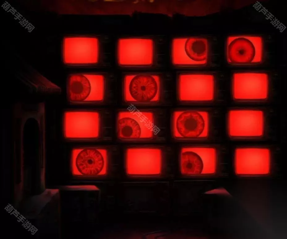 小高能过后电视上的眼睛是有两种形态的,大瞳孔和小瞳孔,眼睛位置也是会变化的,这里就把两张图合在一起吧,大概就是第一行3大4小,第二行1大2小,第三行2大3大,第四行1小3小,记好后就可以后退一下来到冰雪世界,查看右边墙上的机关开始调整了。