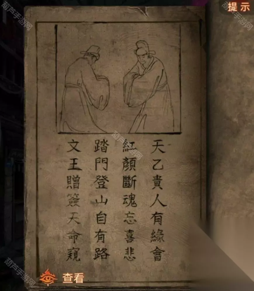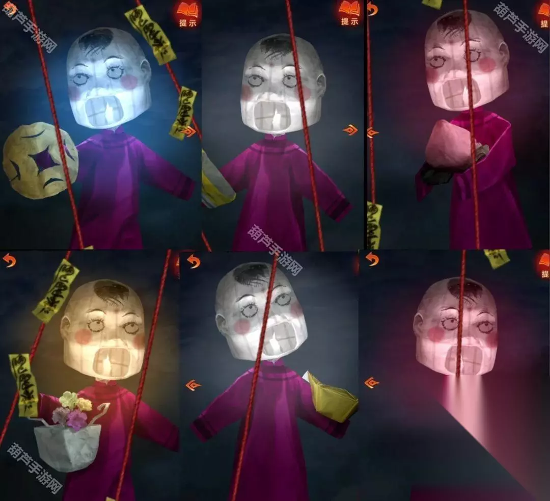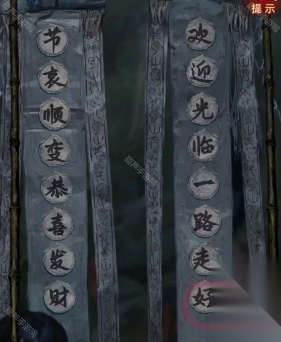 再查看一下左边八不郎,其实不是很重点,后面要用到的时候都会有对应提示的,第三页有个发髻小小的的小人,记下来脸上写的“节哀顺变恭喜发财”,那么我们现在白衣人的线索也齐了,回去调整,注意最下面露出来的头发对应对联位置哦,调整完毕之后白衣人也退散了。