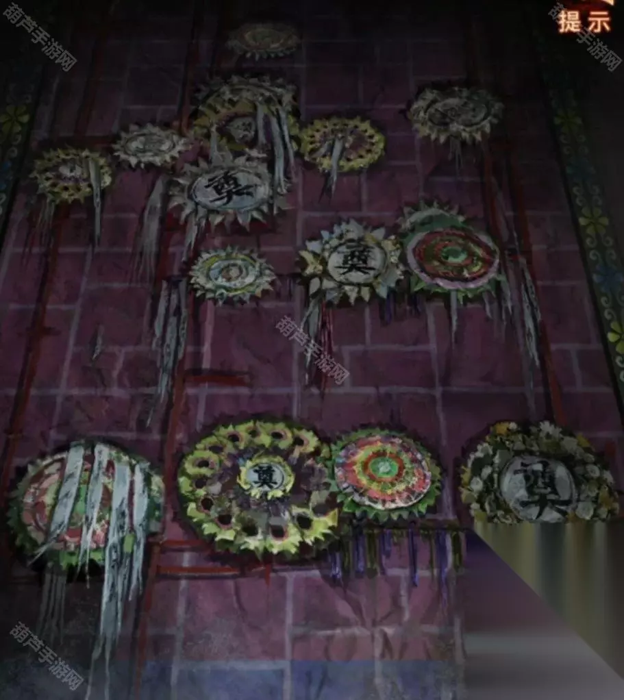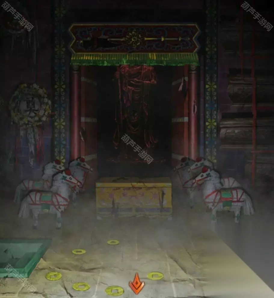 进入宫殿后就看到了马,看来我们的密码又是个多房间数数谜题了,先记下来这个房间有6匹马和7枚纸钱,然后看一下左边的墙上,花圈怎么有点数不清呢,眯起眼来仔细看看,好像也不是非要数得清,这连起来不就是个大写的七一吗,所以花圈代表的数字是71记下来。
