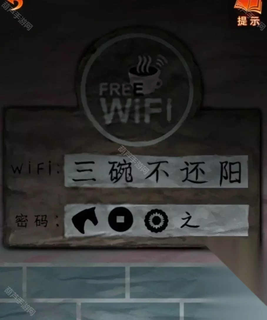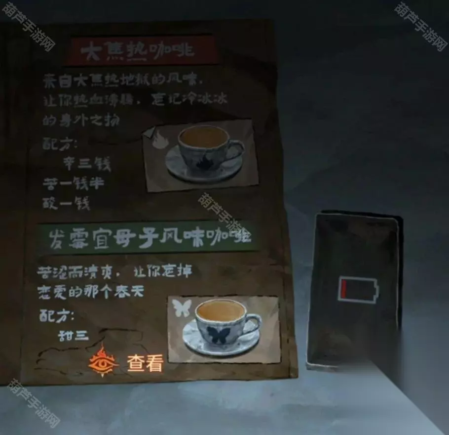 之后查看一下左上角的残书,这个是后面的线索暂时用不到,查看右边墙上wifi后获得手机,注意手机要在这里使用才能输入密码,不过我们暂时还不知道密码,注意一下密码提示马-纸钱-花圈-之。再查看一下桌子上能发现咖啡配方,记一下第一个的配方辛3,苦1.5,酸1.