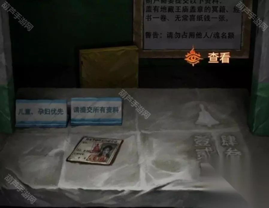 后退出咖啡厅,查看左边的办事处,使用欢迎光临的牌子挡住休息的牌子,果然门开了,进入办事处先查看一下左边的八不郎,牌子说明他是个办假证的,使用二十亿后我们就获得了***,再查看一下右边的窗口,我们需要准备的材料是***、经书、无常喜纸钱,注意证件还需要盖章一会过去。