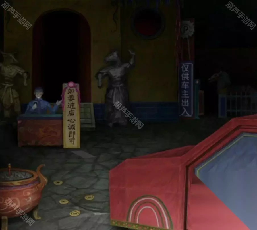后退一下来到停车场场景,数一下地上的纸钱有6枚,加上屋里的7枚现在有13枚了,记得大殿门口还有个马面雕像,这也算是马,所以马有7个,还有一个特别容易被漏掉的就是停车场里面还有个马,就在仅供车主出入的牌子右侧,所以最终马是有8只的记下来。