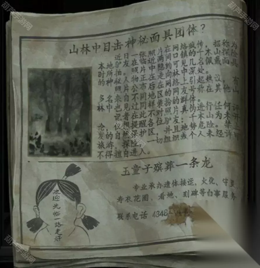 再次后退来到第一个场景,查看右边总伸手的纸人,使用电风扇给他直接吹飞起来,果然没有手来打搅我们了,查看一下他桌子上的书和报纸,线索在右边的报纸上,点击报纸翻到左边,下面有个小广告,小人扎了个小朝天辫,应该是右边的对联,记下来“欢迎光临一路走好”。