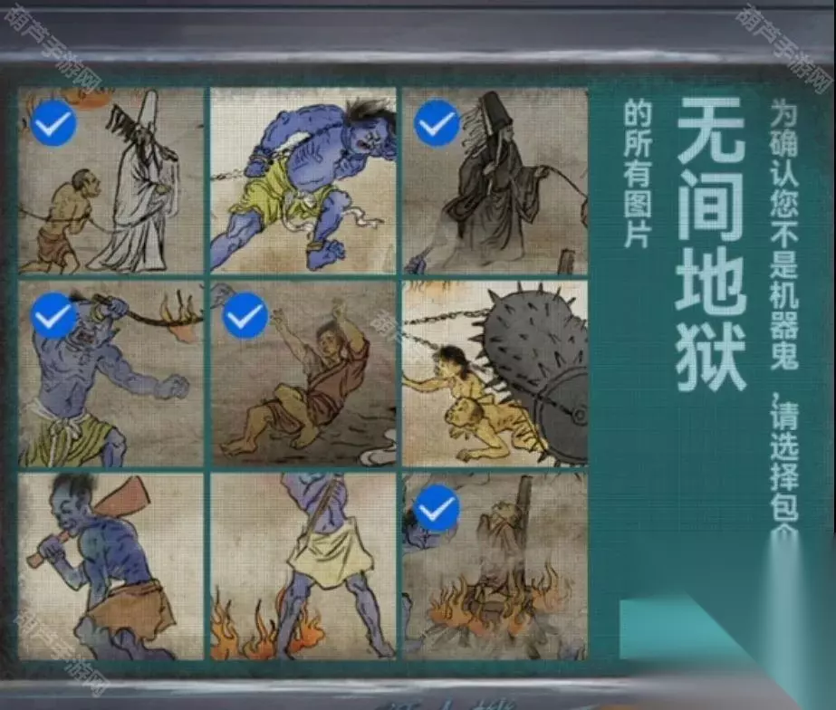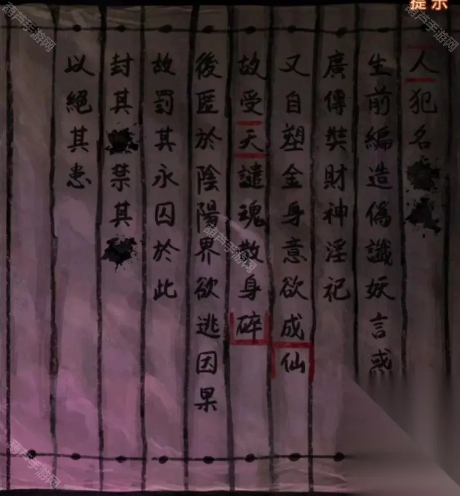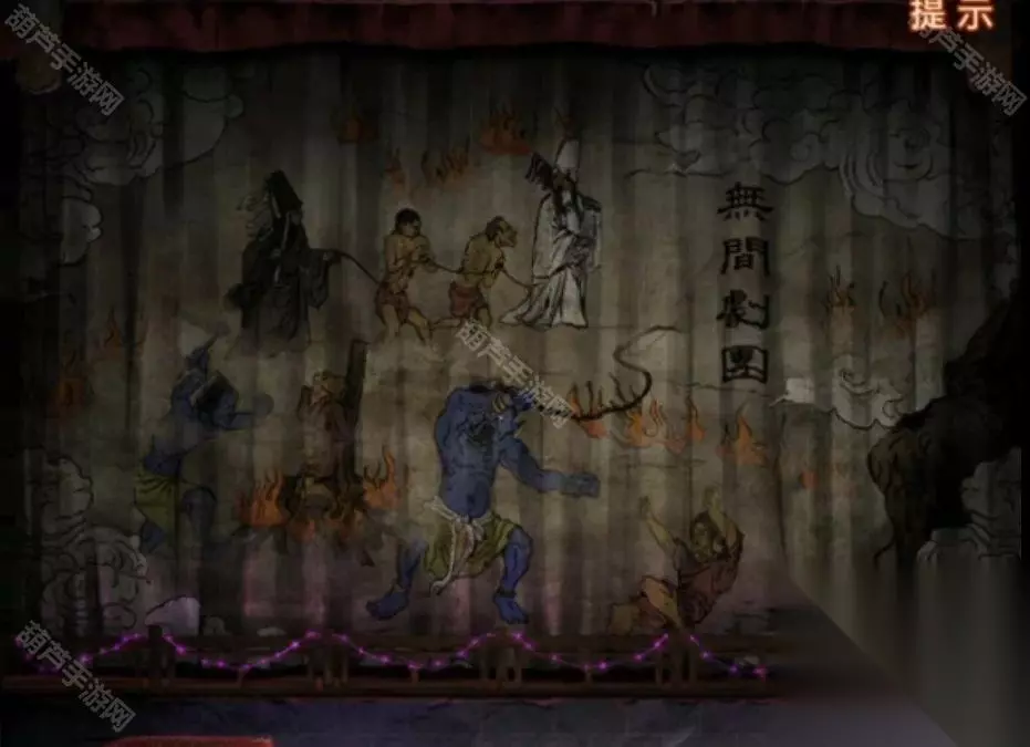 剧情结束之后幕布上出现地狱图,记一下上面出现的都有什么东西,有拉着人的黑白无常,在烧人的鬼和推倒人的鬼,再次回到音乐厅查看纸人机,上面写了可以买一赠一,但是需要填写验证码,将地狱图中出现的内容都选择一下点击验证拿到纸人头发。