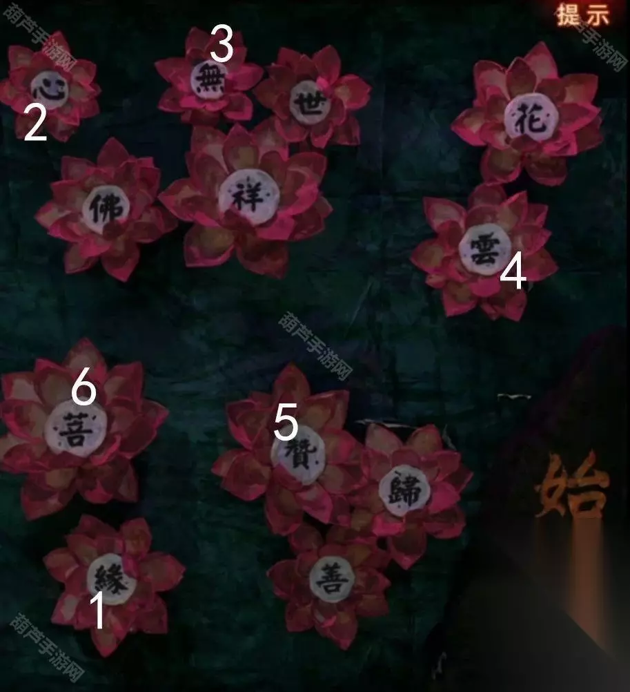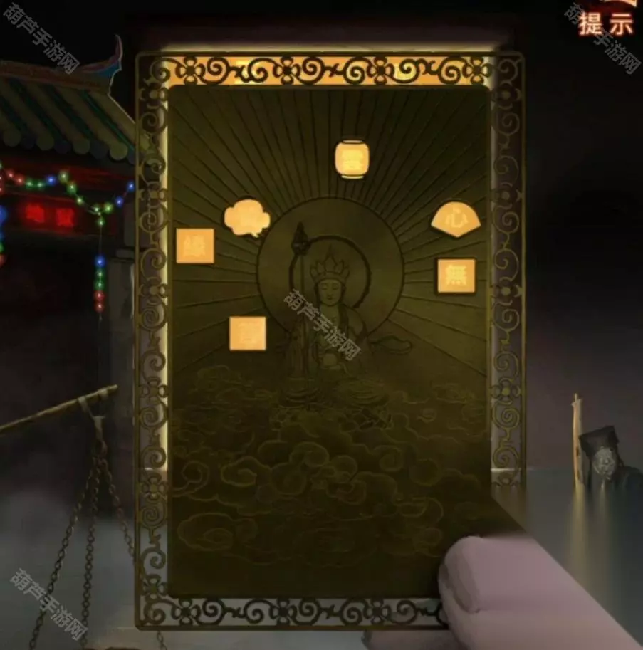 先拿出带孔的小卡片,果然菩萨后面的背景墙上的字会出现在小孔里面,记一下长方形=缘,云朵=赞,正方形=菩,灯笼=云,扇子=心,又一个正方形=无,因为有相似的图形,所以这个可能不是形状线索,把字亮起的顺序也记下来缘-心-无-云-赞-菩,这里其实是循环亮起的,所以第一个字不一定是缘只是记下顺序而已。