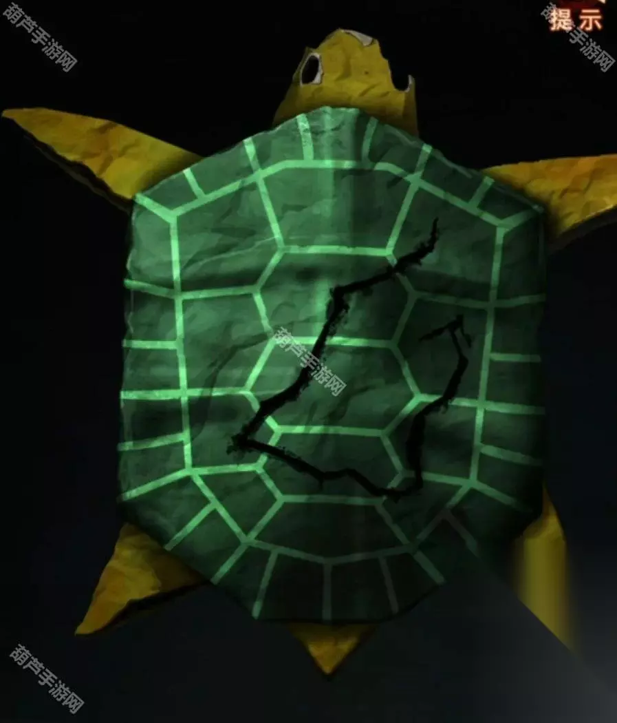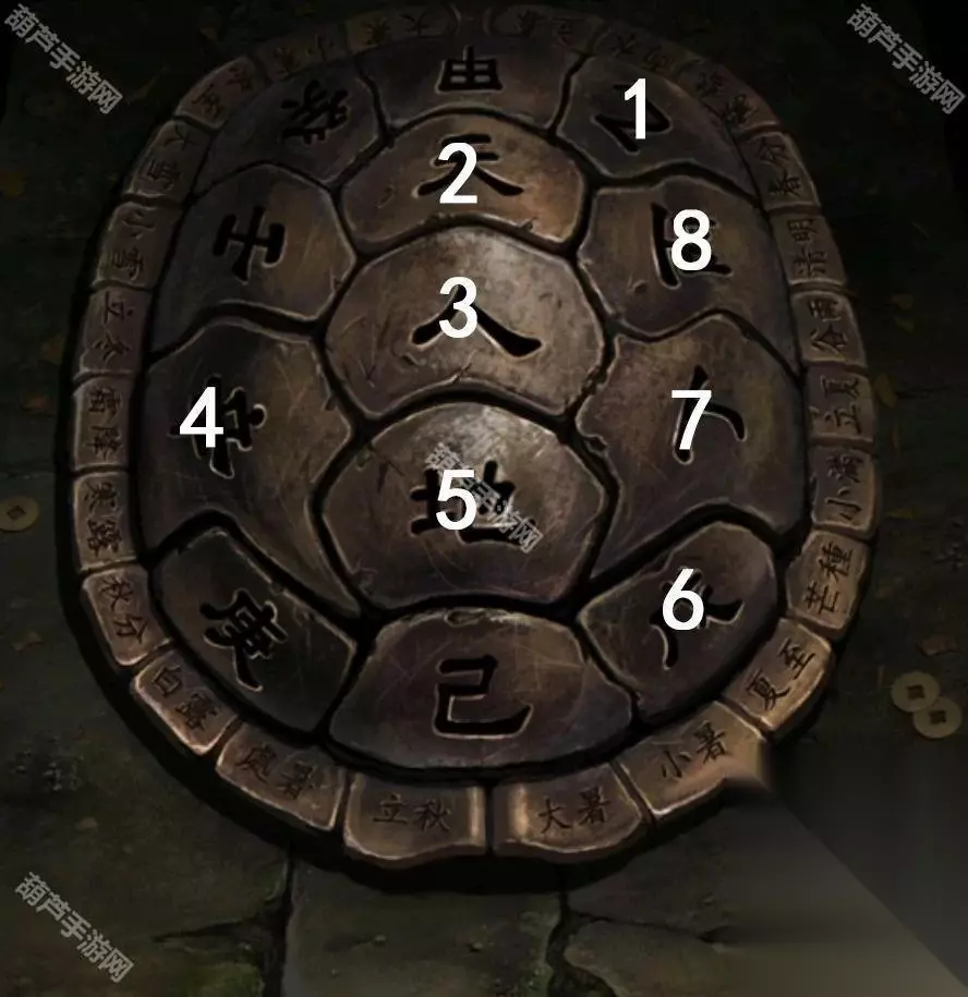 我们正好不知道该怎么敲龟壳,后退一下进算卦右边门,剧情后查看左边的乌龟,按照纸乌龟背上的裂痕点击龟壳,注意裂痕最右边是有个小箭头的,所以顺序就是乙天人辛地戊丁丙,点击完毕后龟壳下面掉出一张路引。