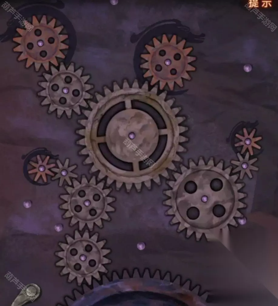 查看左边的箱子一样的东西,使用齿轮后可以开始调整,调整一下齿轮位置,注意大齿轮想要移动要先挪开旁边的小齿轮哦,黑色圈圈内的齿轮是无法移动位置的,调整到如下图,让所有齿轮都能转动起来就能开始木偶戏了。