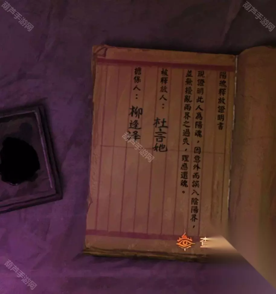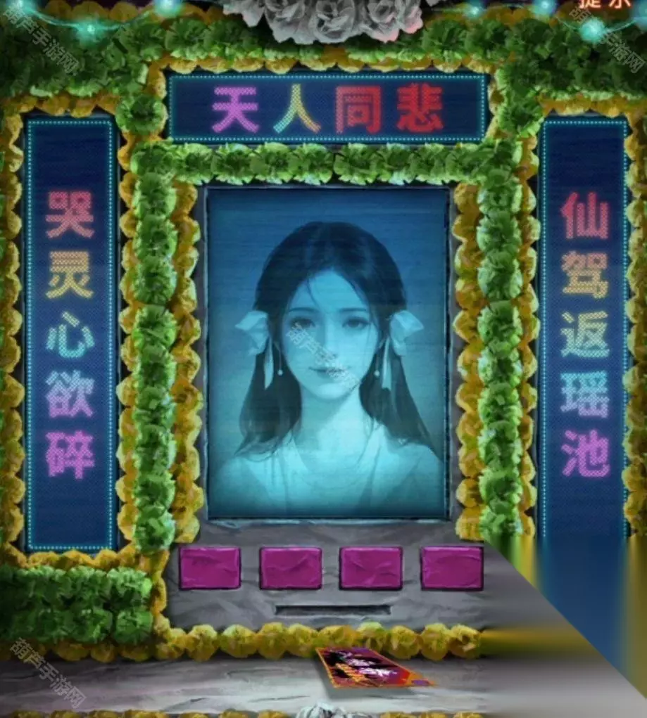 出门来到阴阳牢,先使用毛笔在桌子上登记一下吧,登记结束后从牢狱手中拿到女主照片,再次回到剧场,查看一下舞台上色彩斑斓的赛博灵台,点击照片最下面的那个花坛,花坛移动后出现四个按钮和一条缝,对那条缝放入女主照片后就可以开始调整了,第一个按键是中间照片,自然是调整为女主了。第二个按键是左边的对联,第四个按键是右边的对联,我们前面竹简上看到被上包围的字是仙,被下包围的字是碎,也就是左右对联必定有第一个字是仙和最后一个字是碎的,那么能用的对联也只有哭灵心欲碎和仙驾返瑶池了,竹简上被上下划红线的字是天和人,也就是最上面的横批要有天和人字,那么第三个按钮调整的上面只能是天人同悲了,调整好后如下图拿到入场券。
