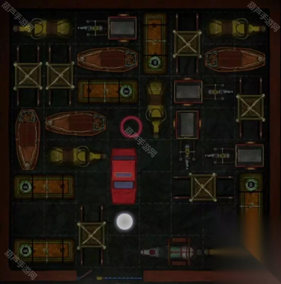 回到左边场景,对停车场的小门使用车钥匙就能玩移车游戏阴间版了,注意所有车都是只能前后移动,我们的目标就是把显眼包红车移动到下面的停车场门口,大概移动到这样子就能开门了,等红车出来后退一下,从停车位的红车伸出的手里拿到钥匙和手串。