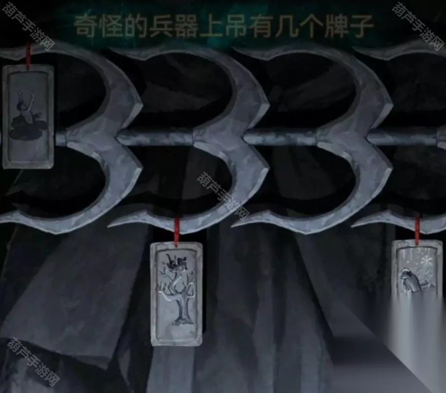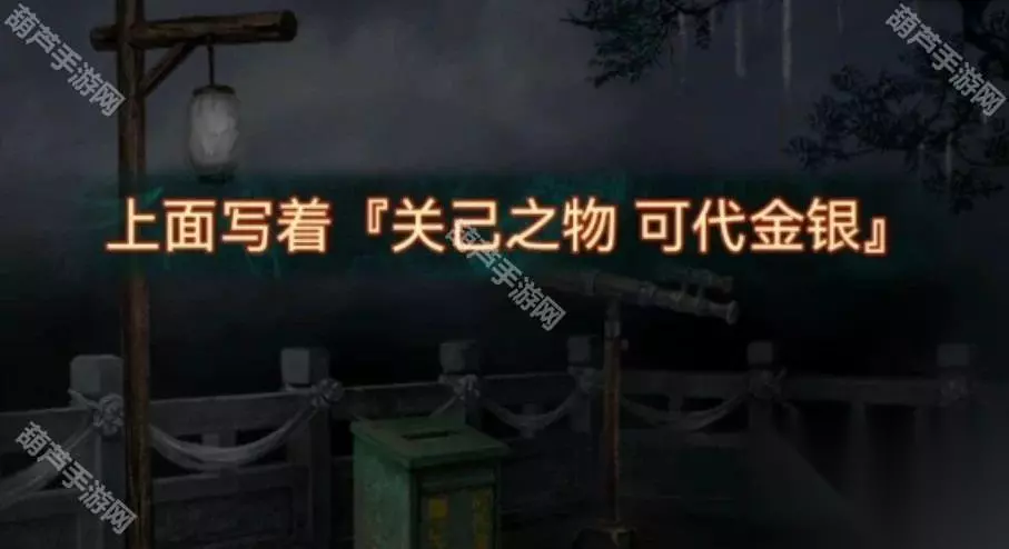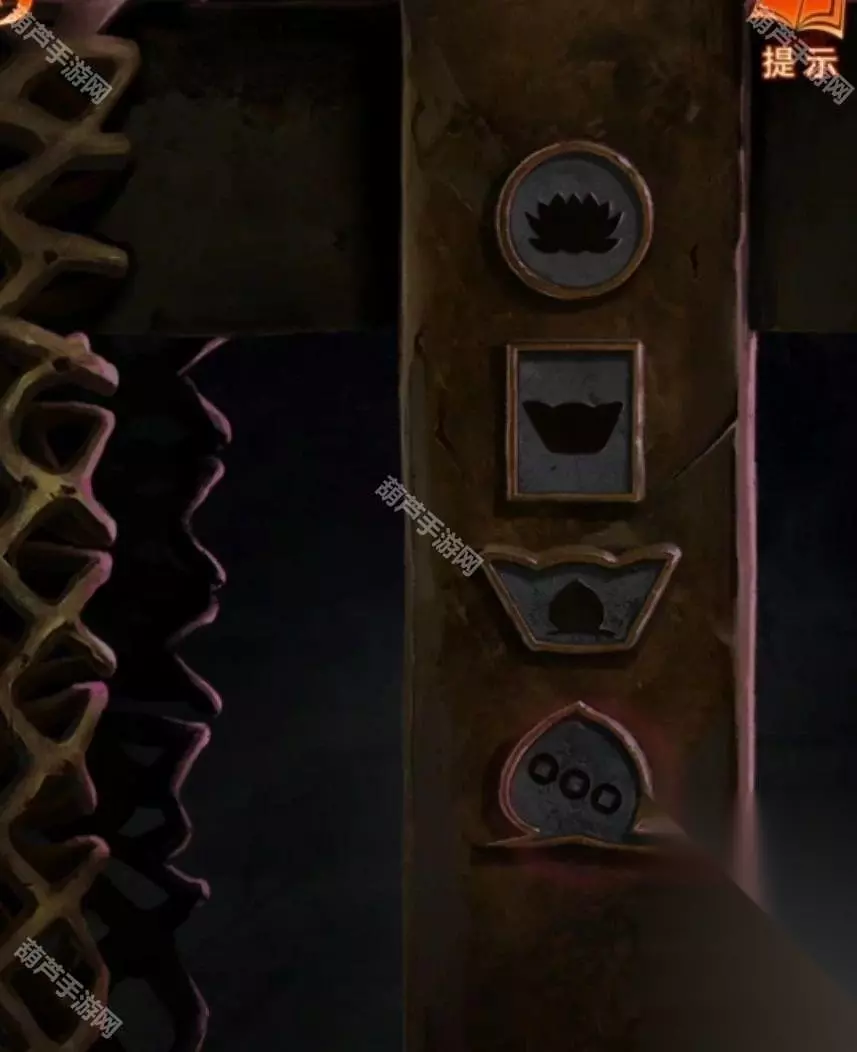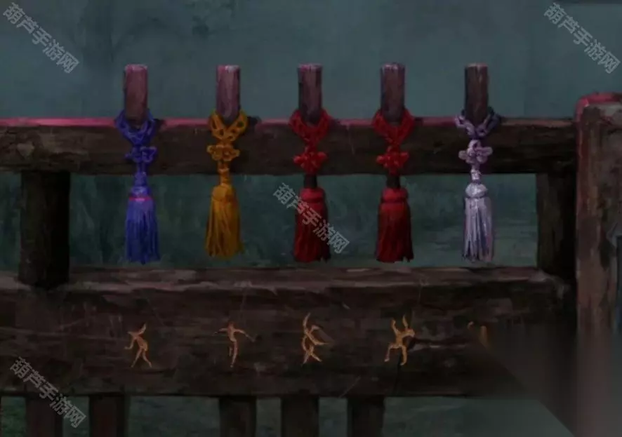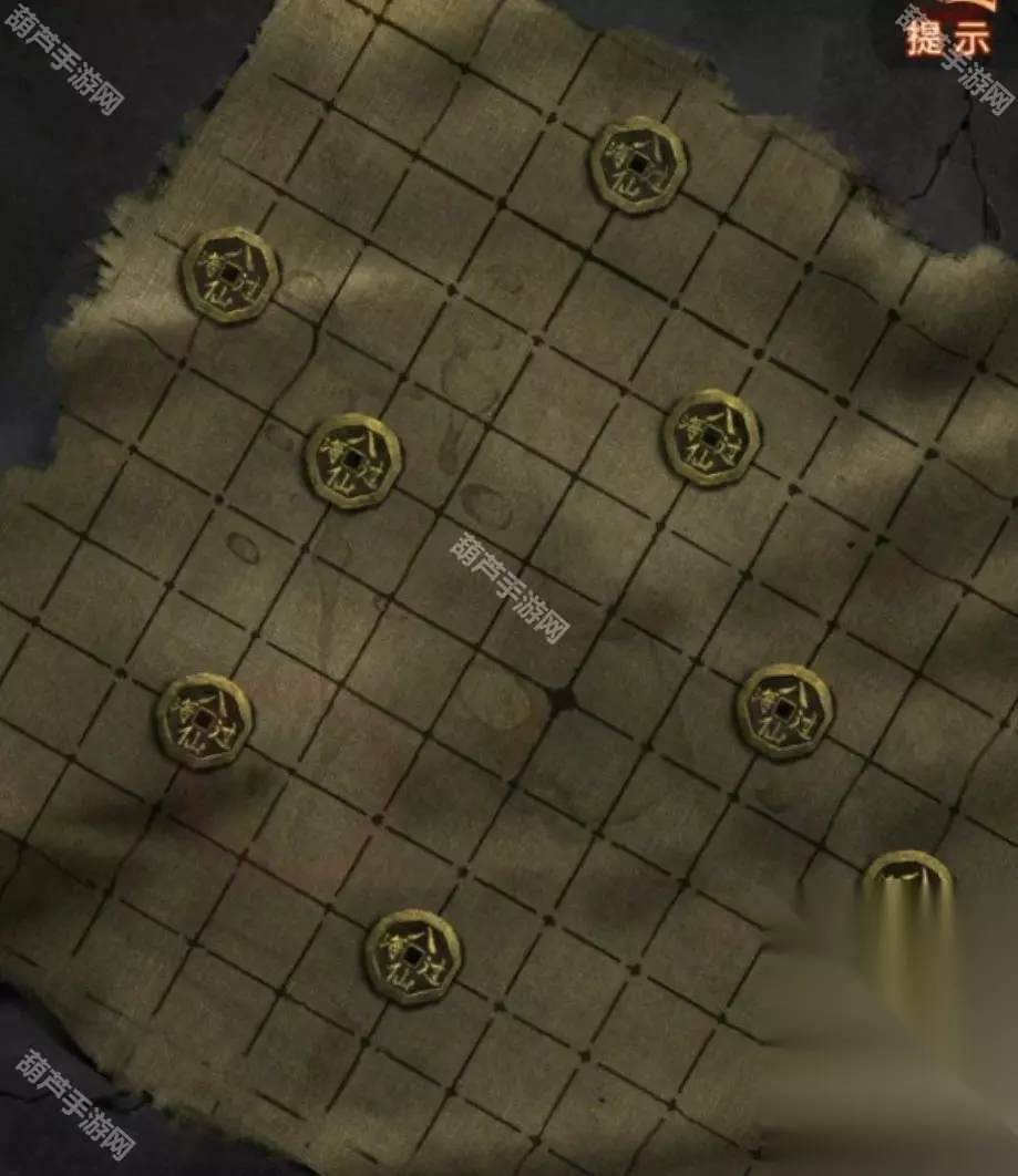 观察一下天上纷纷扬扬的纸钱,发现是有四种样式的,圆形纸钱上画的是莲花,桃形纸钱上画的是三个圈,方形纸钱上画的是元宝,元宝形纸钱上画的是桃子,记下来后查看左边的铜渔网,柱子上的图案不就对应纸钱图案了,调整一下拿到铜渔网。