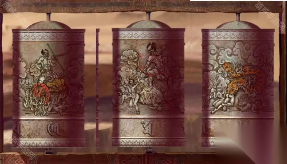 这个图案看起来也有些眼熟,后退一下来到沙漠,查看中间旋转圆筒,记下来车轮、弓箭、龙对应的符号,这里其实不确定那是龙还是蛇,好像是一条大蟒蛇,这不重要,如果难判断最后一个对应符号是这一个还是继续转的那一个,我们可以都记下来穷举一下就行了~遇到谜题有歧义最好的办法就是穷举法。