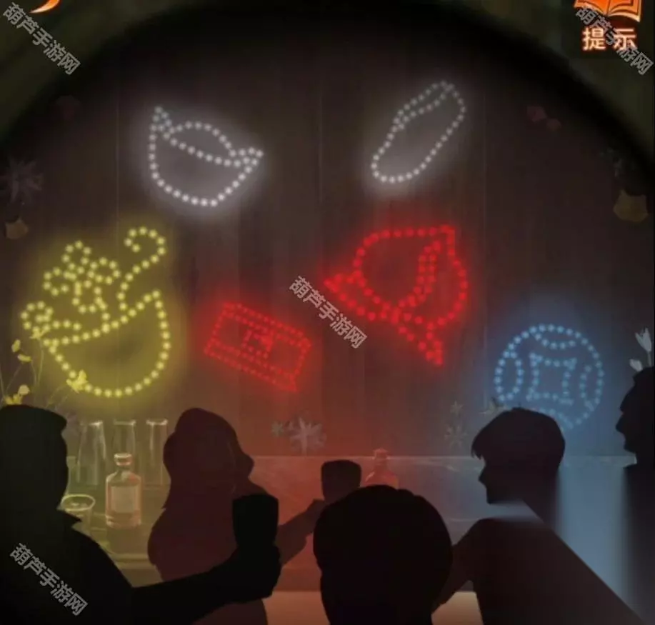 后退一下进算命右边的门,既然下下签都和男主有关那么遗照肯定也是有关了,对中间的箱子使用遗照后灯变了颜色,再次查看望远镜,发现灯光的颜色和形状都很眼熟,记下来红色桃子+箱子,白色元宝+鞋,黄色咖啡?蓝色铜钱。