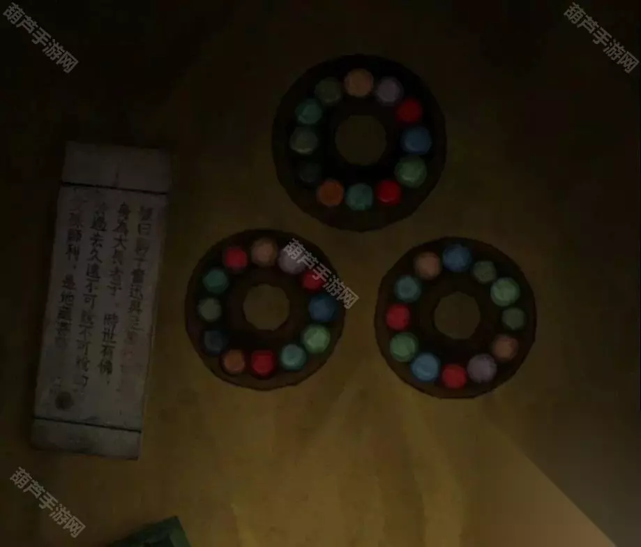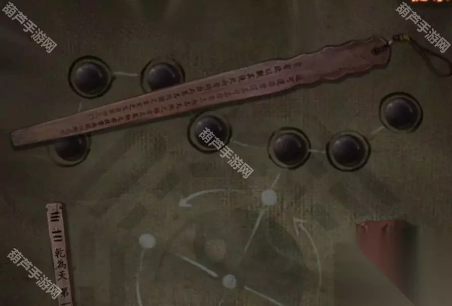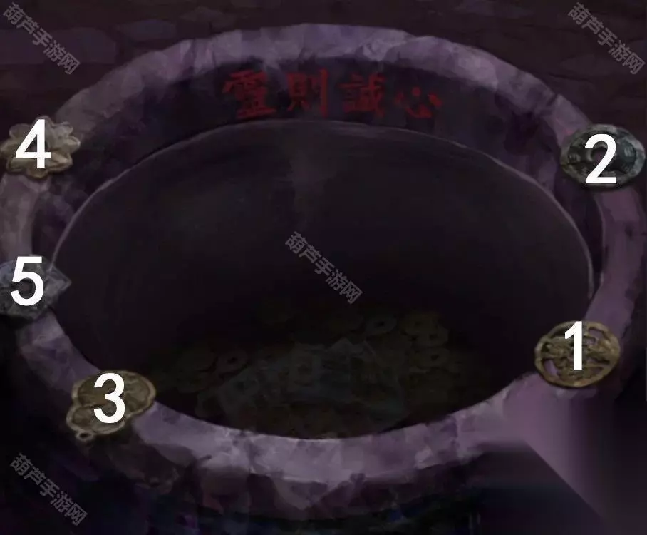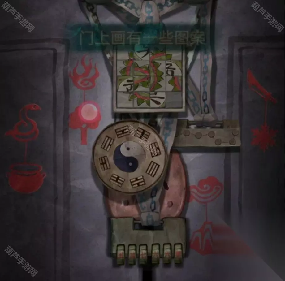 剧情过后拿走水缸旁边的花钱,右边倒吊人手里拿到有孔的卡片,左边有一串图案记一下,是从下往上的窗花-圆形-葫芦-小花-五边形,查看左边的柜子,从唱片机上拿到五枚纸钱,对中间水缸使用纸钱后按照右边门上的顺序依次点击纸钱,五枚纸钱扔完小高能注意,后退一下就发现门开了,进入菩萨房间。