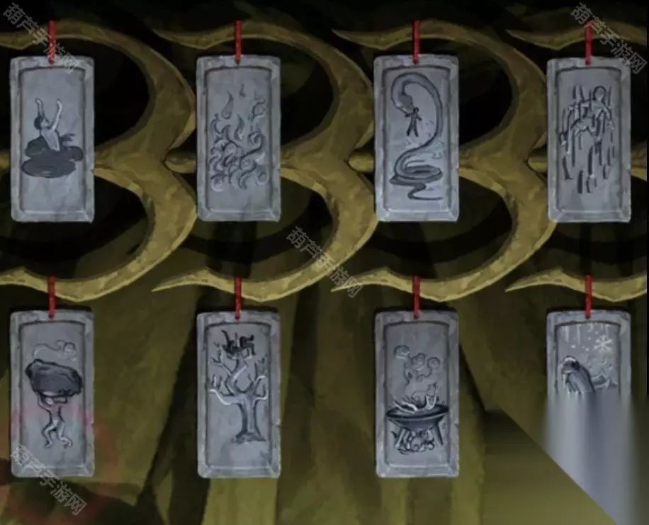 首先调整牌子上已经确定位置的三个,左上角是在水里的人,那么左下角肯定是关联的山,也就是抬着大石头的人。左边第二个下面是树,那么上面就是和树关联的火。右下角画了个雪花,也就是雪,所以上面是和雪关联的刀,这里和刀有关的就是刀山了。最后的蛇-锅只能放在第三个的位置上了,调整完毕后图片闪过两个雕像。
